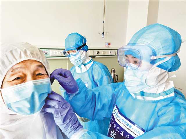 3月18日,重庆医疗队医生正在为即将出院的患者换上隔离服。 |