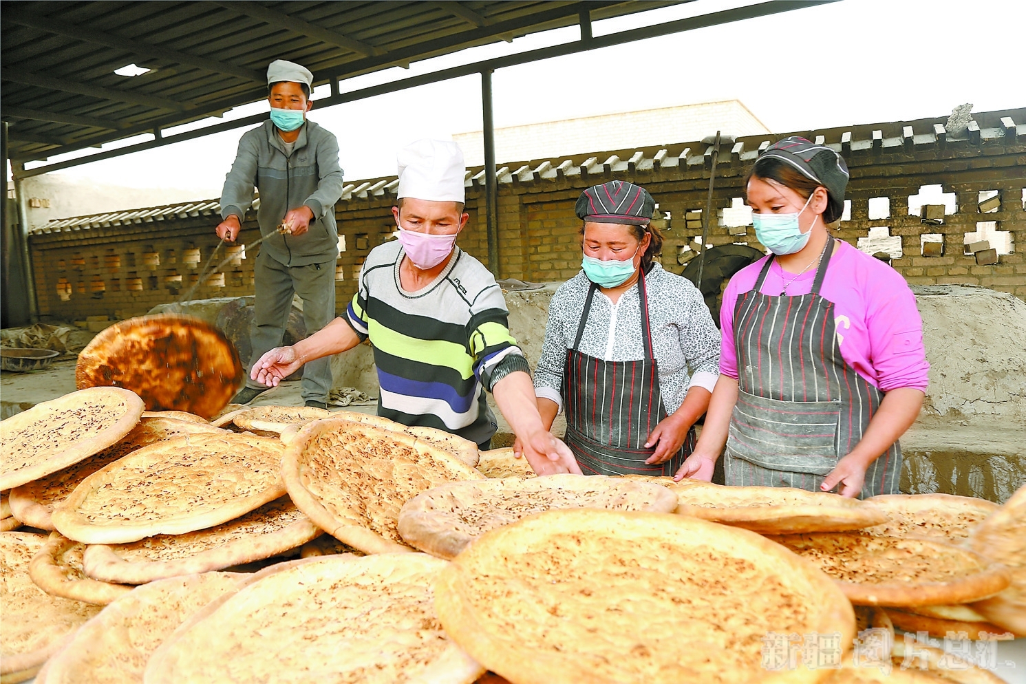 4月12日,村民在扶贫特色打馕店生产馕。今年,轮台县供销社驻草湖乡阿克库木村“访惠聚”工作队整合当地小作坊馕店,成立农民特色打馕店,带动全村11名贫困村民稳定就业,人均月收入1500元以上。 □张慧勇摄