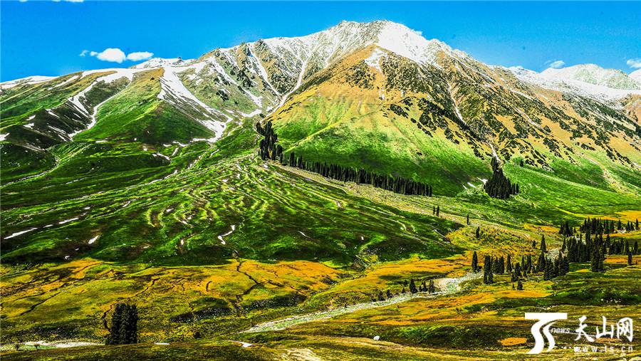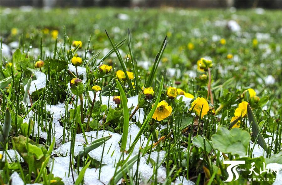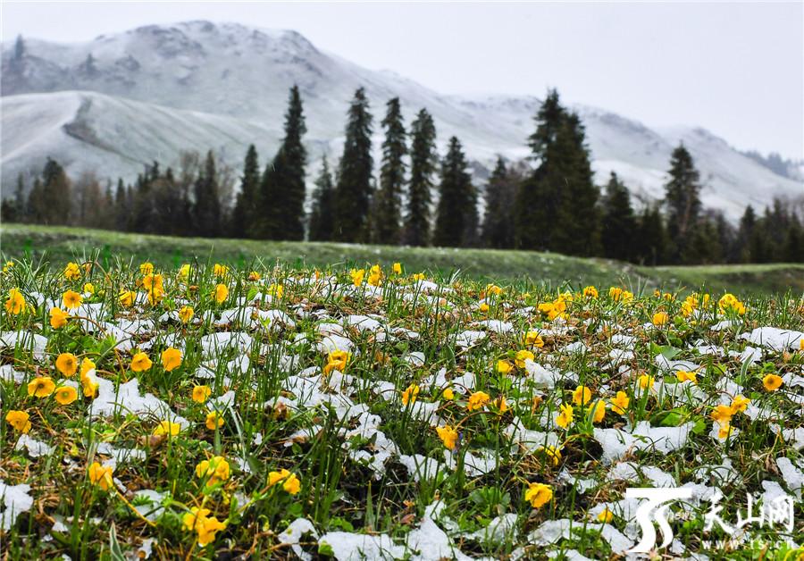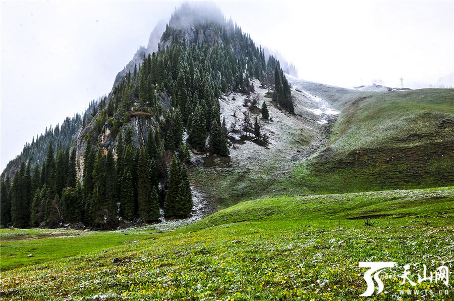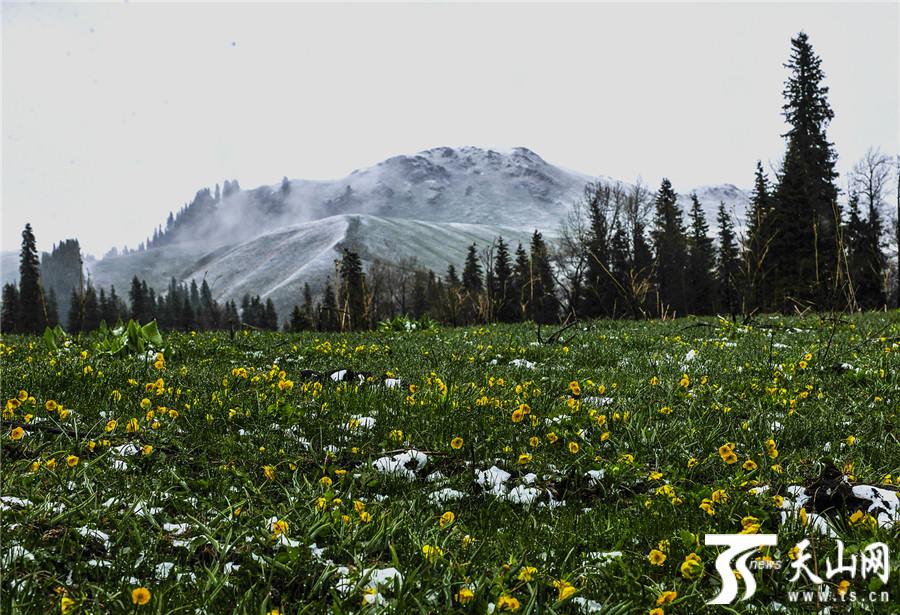 天山网讯(通讯员陈华林摄影报道)2020年4月18日拍摄的雪后新疆伊犁哈萨克自治州尼勒克县唐布拉大草原景色如画。春天迈着轻盈的脚步,不经意间来到天山深处的尼勒克县唐布拉大草原,草原冰雪渐渐消融,草场开始泛绿,有的山花已经破冰绽放,显示出顽强的生命力。此时的唐布拉大草原别具“神韵”,山上云雾缭绕,山巅白雪皑皑,山下绿草如茵,山花烂漫,让人如坠仙境。