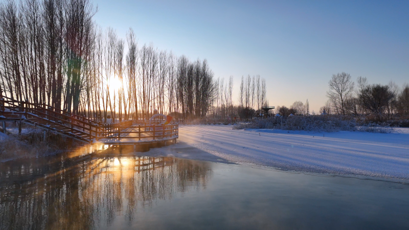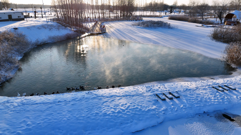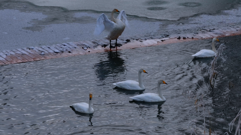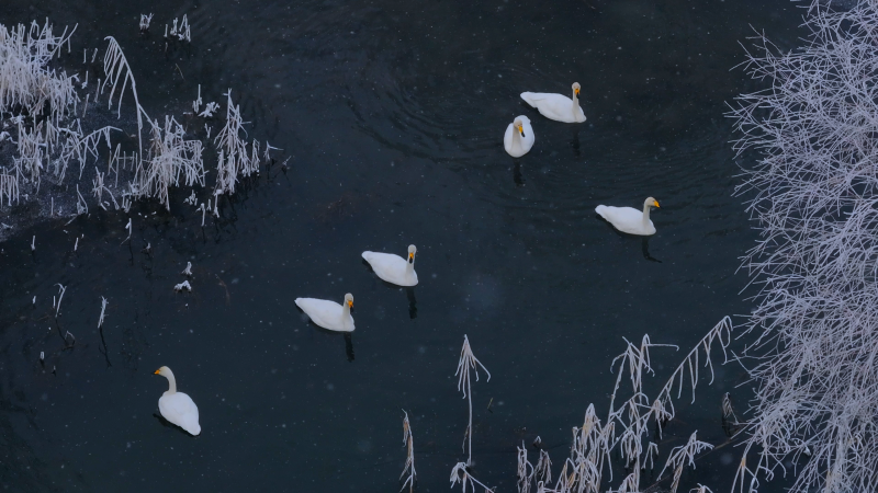 河水静卧其间,宛若一面未经雕琢的银镜,倒映着纯净无瑕的世界。而那群悠然自得的白天鹅轻盈地点缀在镜面之上,为这静谧的画面添上了几分生动与灵气。