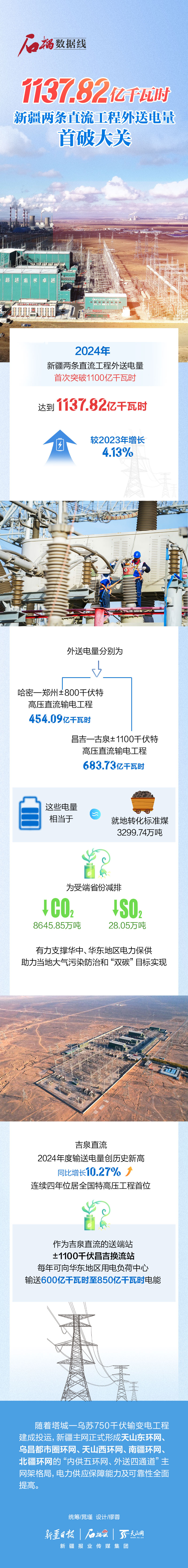 新疆两条直流工程2024年外送电量达到1137.82亿千瓦时,首次突破1100亿千瓦时大关,较2023年增长4.13%,在把新疆资源优势转化为经济优势的同时,有力服务全国电力保供大局。在外送的1137.82亿千瓦时电量中,哈郑直流外送电量454.09亿千瓦时、吉泉直流外送电量683.73亿千瓦时。