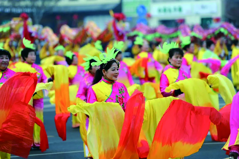 在老一辈人的记忆中,伴随社火秧歌还流传下来许多与祝福、祭祀有关的传统习俗。比如,大年初一时,一些乡镇会组织社火秧歌走街串巷大拜年;还比如,元宵节前后,一些社区也会提前策划各种丰富多彩的社火秧歌表演,为大家送上吉祥祝福。更让人喜悦的是,如今在一些农村,谁家有娶亲婚嫁、老人过寿等喜事,主办者都会精挑细选,提前排练拿手的秧歌表演,热热闹闹送上祝福。这些传统文化不仅在黄河流域、中原地区延续下来,而且流传到玛纳斯河流域后,得到了进一步丰富和拓展,保留至今,绵延不断,深受当地各族人民的喜爱。