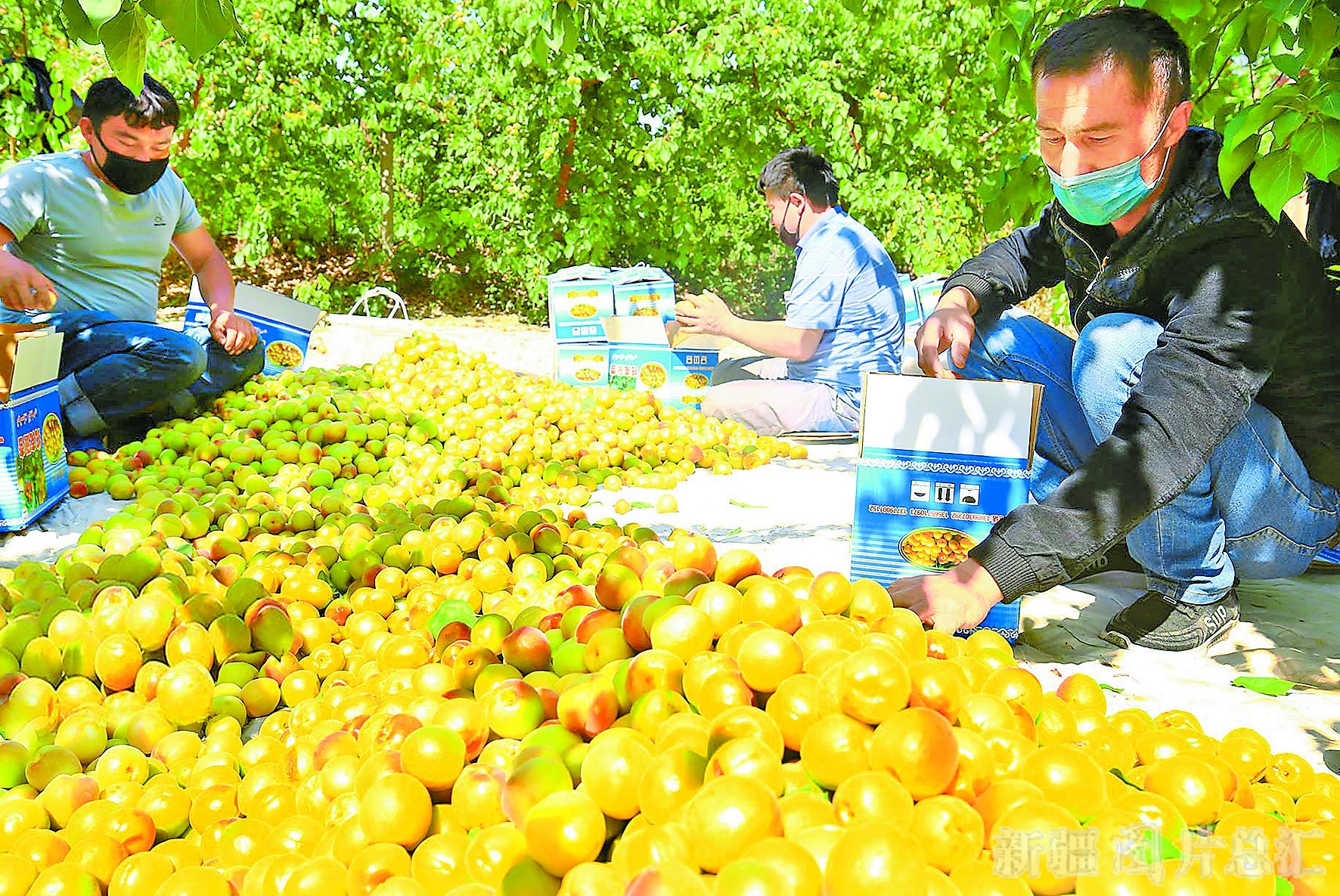5月8日,托克逊县夏镇铁提尔村村民忙着分拣包装刚刚采摘的杏子。随着气温升高,托克逊县万亩杏园杏子开始大面积成熟,吸引了来自全国各地的客商收购鲜杏。 □李靖海摄