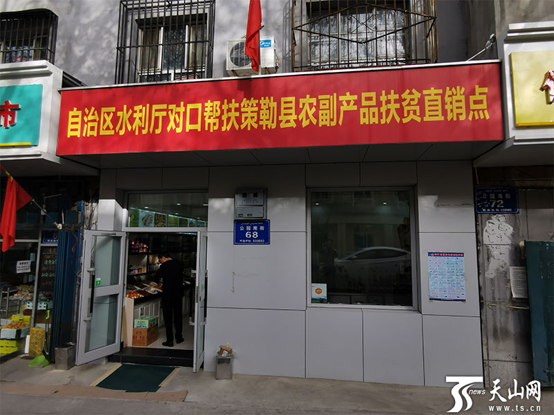 走进乌鲁木齐市公园南街68号——“自治区水利厅对口帮扶策勒县农副产品扶贫直销点”。