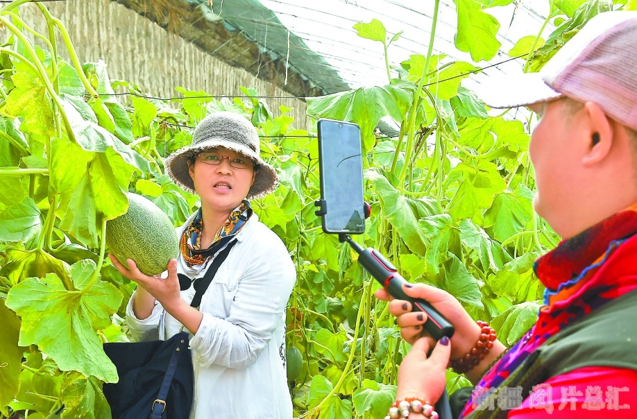 5月10日,网红主播在吐鲁番市哈密瓜种植基地直播。“2020吐鲁番哈密瓜,把甜蜜健康送到家”暨百家电商企业、百名网红进瓜地网上推介销售活动在吐鲁番市高昌区、鄯善县、托克逊县同时举行。 □刘健摄