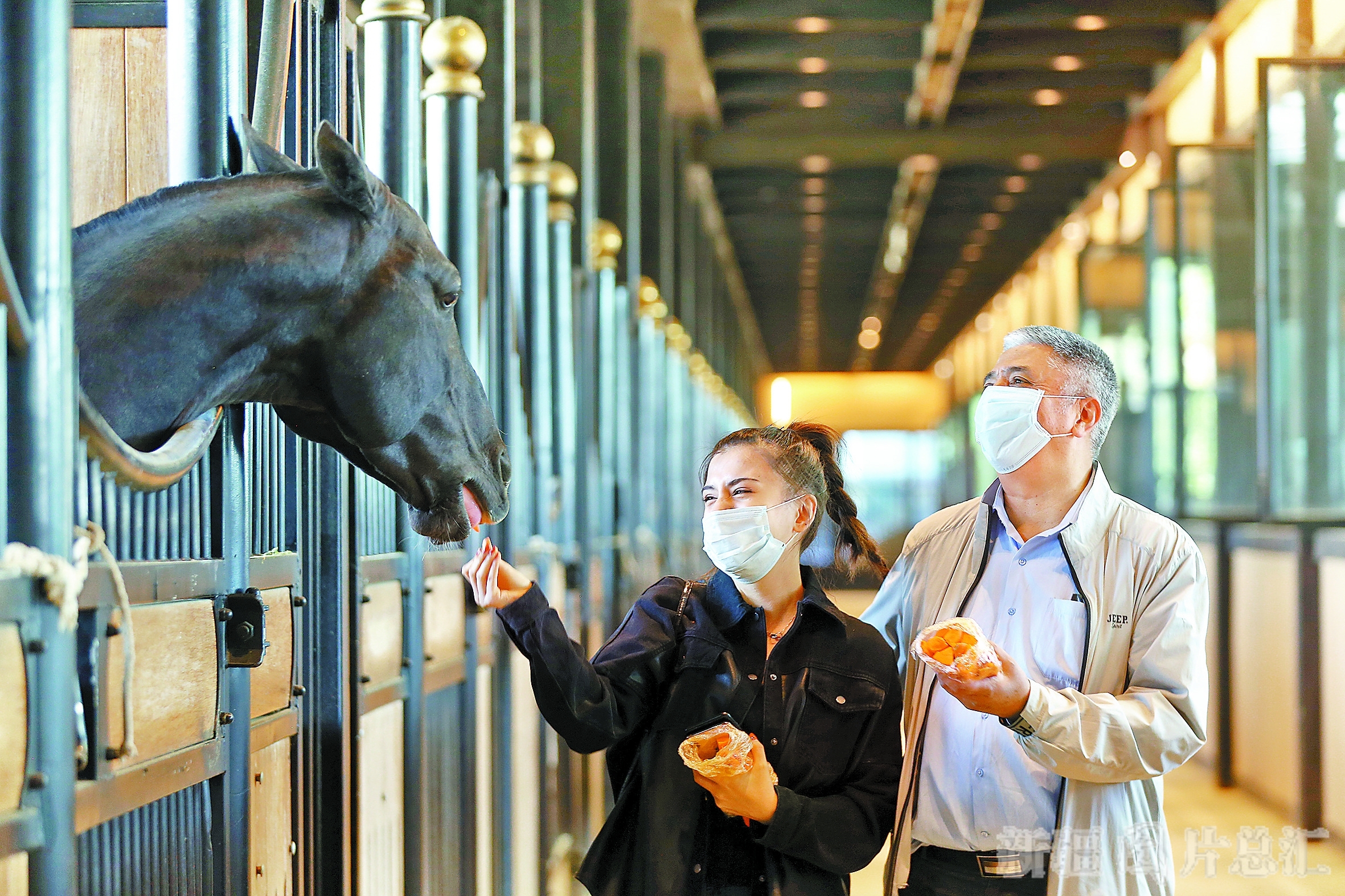 5月7日,游客在新疆古生态园喂马。该生态园中的汗血宝马、胡杨林、硅化木等吸引了各地的游客前来参观游览。 □本报全媒体记者 李瑞摄