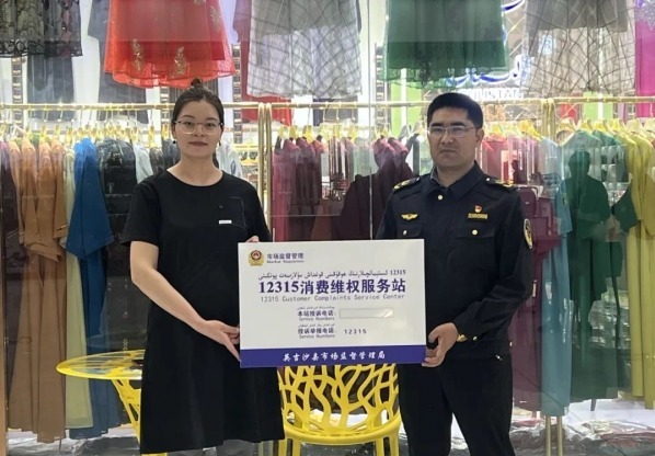 2024年4月28日,英吉沙县市场监督管理局工作人员在夏尼亚孜服装城进行12315消费维权服务站授牌。英吉沙县融媒体中心尹佳徽摄