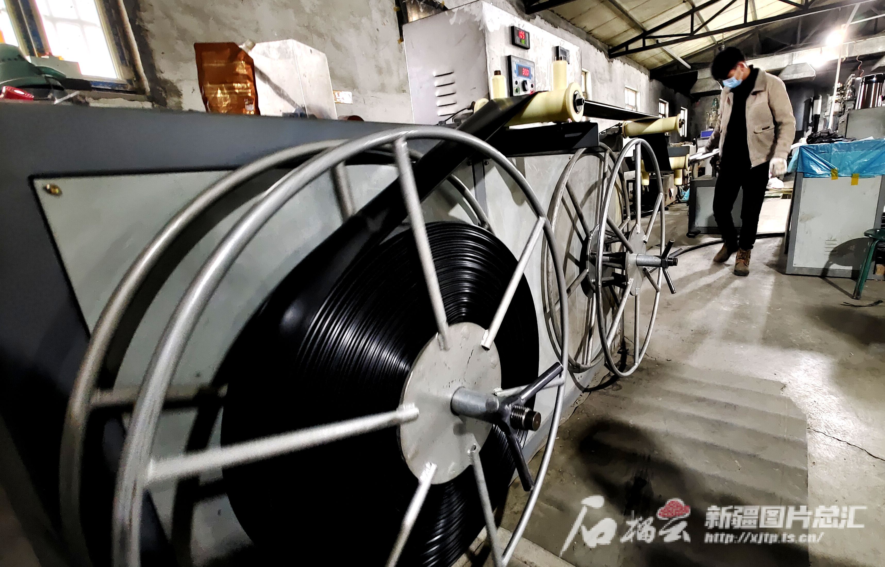 在博乐市阿热勒托海牧场的亿凯塑料制品有限公司,生产现场一片繁忙。3条生产线满负荷运转,工人们熟练操作设备,每日约300件滴灌带成品从这里产出。技术员张磊介绍,“生产全程严格采样质检,保障产品质量。”