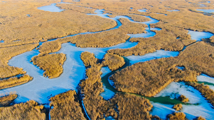 3月,春风剪开冬日封冻,新疆伊犁哈萨克自治州新源县那拉提国家湿地公园成了大自然的画布,初融雪水似流动画笔,在纵横河道、广袤滩涂绘出奇妙纹理,或深或浅,像蜿蜒水墨,又似抽象几何。每一道褶皱、每一条曲线,都是季节更迭留下的细腻笔触,书写着独属于春日的诗篇。