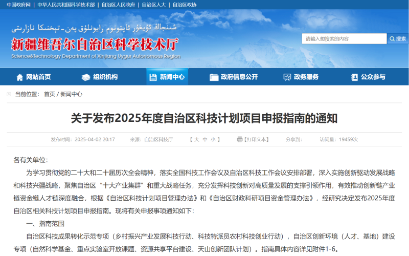 自治区科技厅官方网站截图。 今年自治区级科技计划项目包括2大专项6类项目指南,其中自治区科技成果转化示范专项包括乡村振兴产业发展科技行动与科技特派员农村创业行动,前者涉及粮油和食品加工产业、棉花产业、绿色畜产品、优质果蔬产业等领域,旨在加快科技成果的引进与示范,实现新成果、新技术在产业链各个环节的转化应用;后者主要聚焦产业科技需求,突出科技特派员农业科技创新服务、成果转化和推广服务三大核心功能,加快产学研深度融合,促进农业生产及发展方式转变。 自治区创新环境(人才、基地)建设专项,涵盖自然科学基金、重点实验室开放课题、资源共享平台建设、天山创新团队计划等项目。自然科学基金项目包括重点项目、杰出青年科学基金项目、面上项目、青年科学基金项目。重点实验室开放课题项目主要支持与本领域国家实验室(基地)、全国重点实验室建立合作关系的自治区重点实验室,每个重点实验室仅限申报1项。资源共享平台建设项目重点支持建立较完备的科学数据(文献)共享平台、实验动物共享平台、研发投入监测服务平台等。天山创新团队计划项目将聚焦自治区“十大产业集群”以及人工智能、生命健康、“双碳”等前沿领域,培养支持一批梯队合理、结构优化、高效协同的科技创新团队,开展基础研究和关键核心技术研究,解决“卡脖子”关键核心技术问题。 申报主体须为新疆境内注册的独立法人单位或中央驻疆非独立法人机构,具备科研能力及健全管理制度。项目负责人年龄原则上不超过退休年龄(企业项目负责人可放宽至65岁),且同期仅能主持1项在研项目。行政单位、公务员不得牵头申报。存在科研失信、到期未验收项目超限、重复申报等情形的单位或个人将被限制申报。 项目申报单位需通过自治区科技厅网站(kjt.xinjiang.gov.cn)的“新疆科技计划管理公共服务平台”进行网上申报。经费“包干制”试点单位申请人在申报自治区自然科学基金面上项目、青年科学基金项目、自治区科技特派员农村创业行动服务项目时,无需填写经费预算书。涉及生命科学、人工智能等领域的项目须提交伦理审查报告。更多信息可登录自治区科技厅官方网站查询。