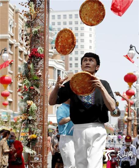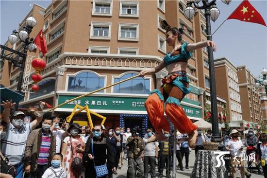 5月19日,在新疆国际大巴扎步行街,一位演员为游客表演杂技。