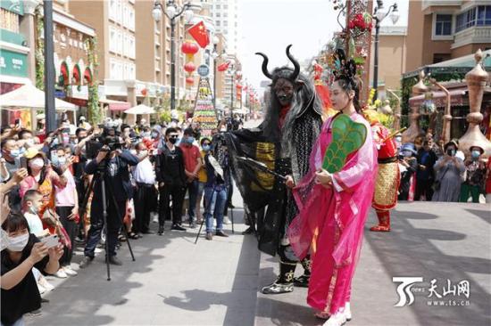 5月19日,在新疆国际大巴扎步行街,“牛魔王”携“铁扇公主”为游客们表演节目。