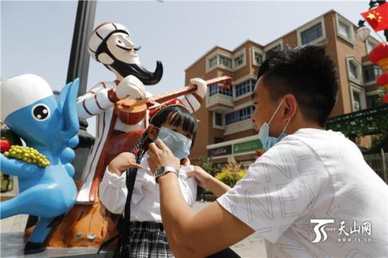 5月19日,在新疆国际大巴扎步行街,一位小姑娘正准备和“阿凡提”拍照留念。