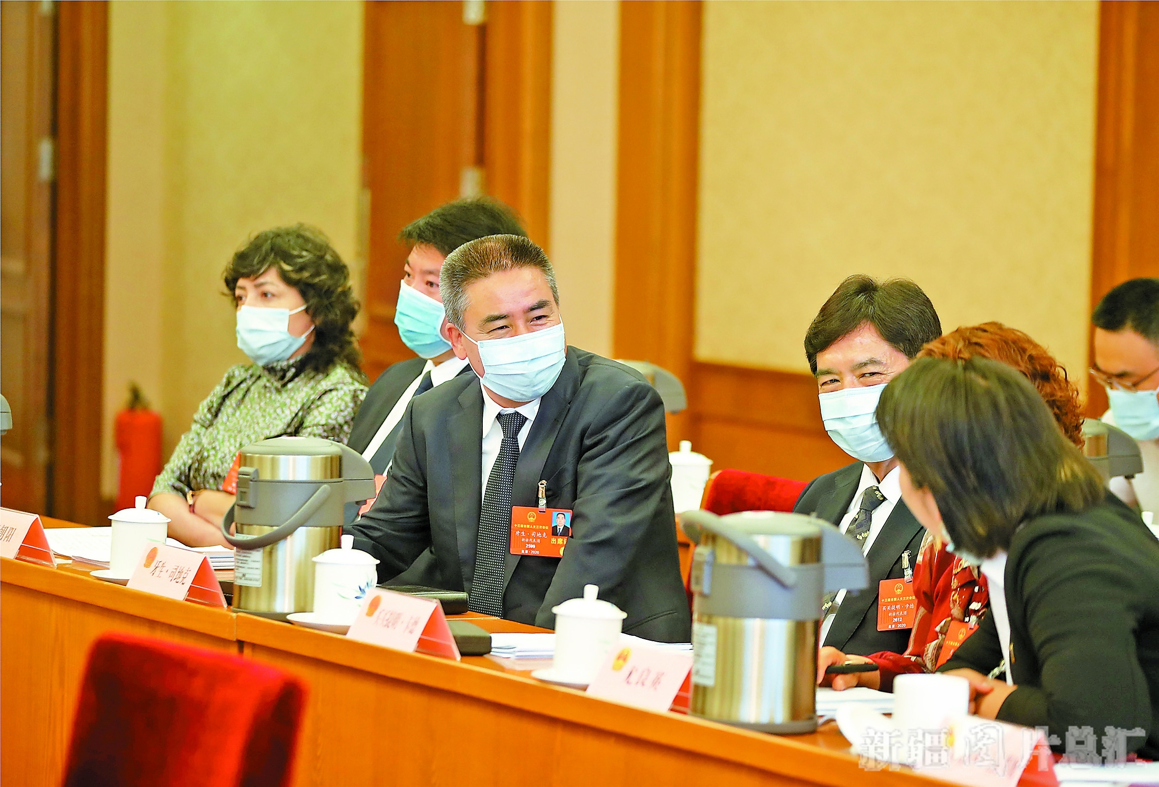 图①:小组会议召开前,牙生·司地克代表(左三)与其他代表交流全国人大常委会工作报告内容。