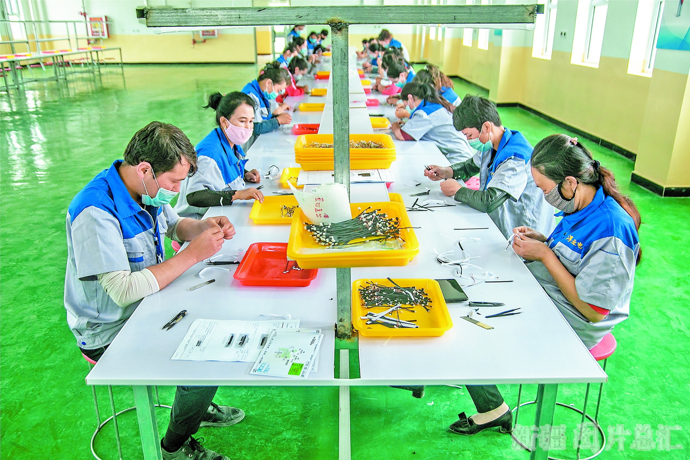5月18日,工人在乌什县阿合雅镇托万克库曲麦村一家电子装配企业生产车间工作。该企业由阿克苏地委组织部驻该村“访惠聚”工作队申请援疆资金300万元建成,可提供300多个就业岗位。 □段小毛摄