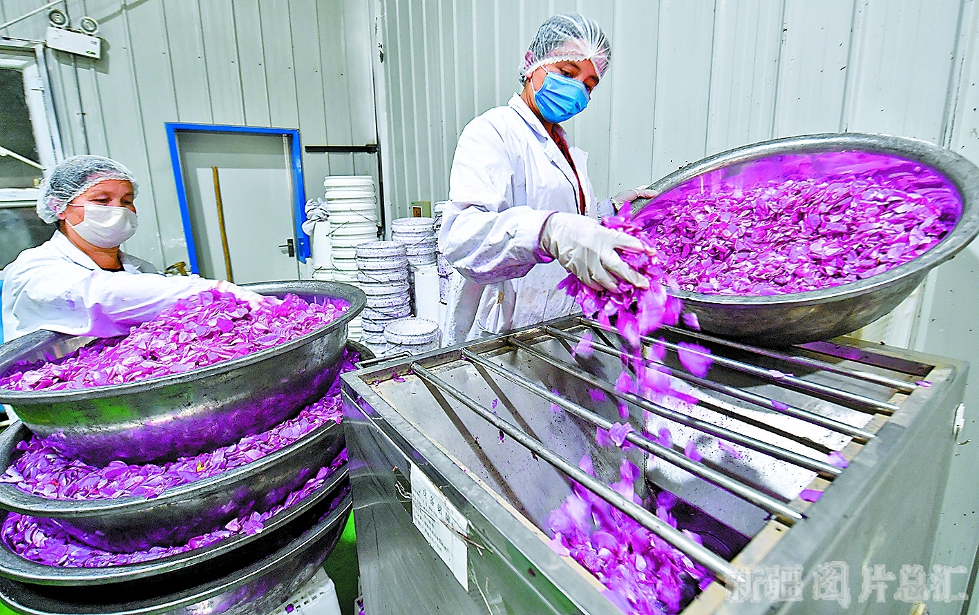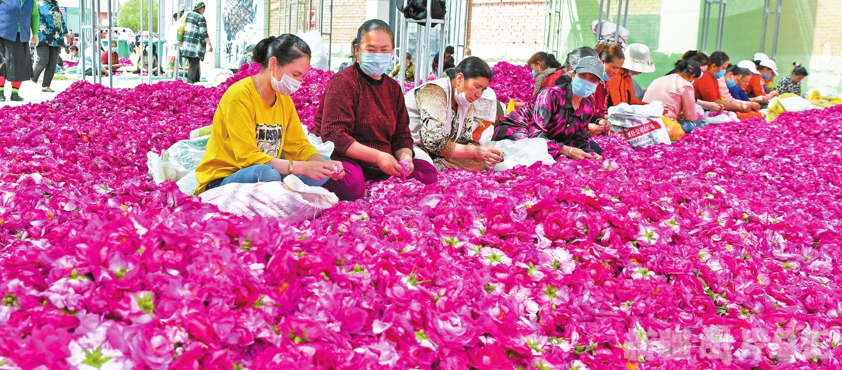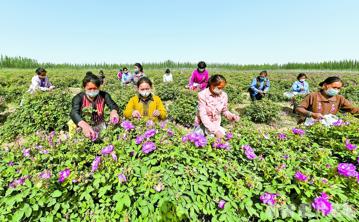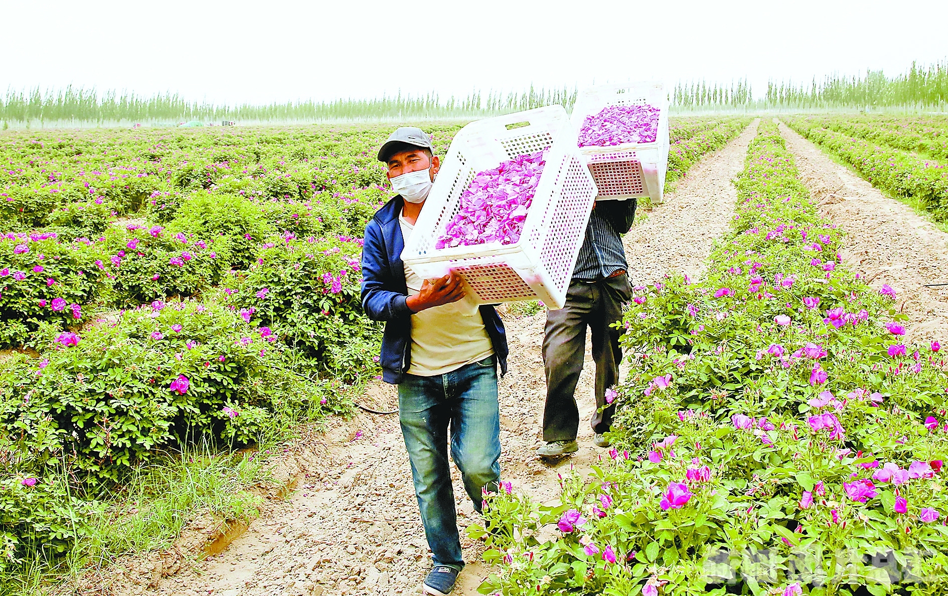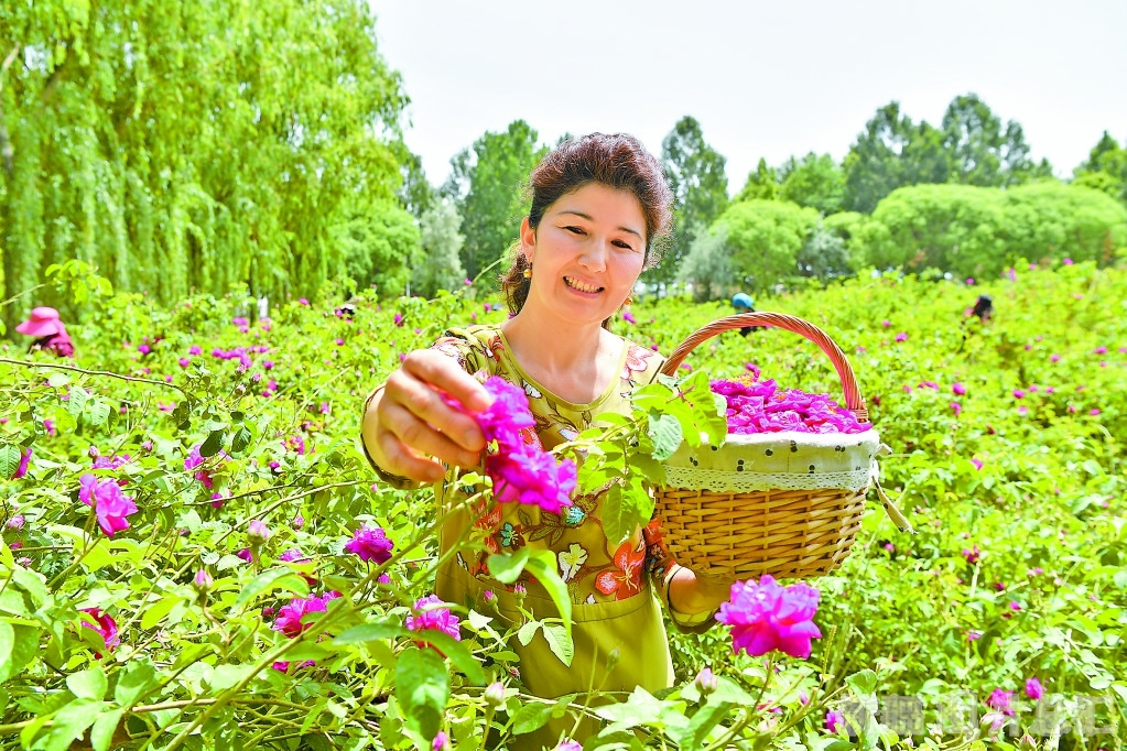 □文/本报全媒体记者 拍热扎提·阿不都 图/本报全媒体记者 周鹏 “我们世世代代种植玫瑰花,没想到它有一天会成为我们收入的主要来源。”5月15日,在于田县阿热勒乡拜什托格拉克村,村民艾妮帕·阿布都艾尼将采摘好的玫瑰花过完秤后对记者说。 眼下,位于塔克拉玛干沙漠南缘的和田地区多个县市一片姹紫嫣红,竞相开放的玫瑰花芬芳四溢,玫瑰花产业已成为当地农民增收致富的重要产业。 “今天我摘了27公斤玫瑰花,卖了300多元,年底我家两亩地大概能收入9000元。”艾妮帕高兴地说。艾妮帕所在的于田县地处沙漠边缘,光照充足,土质疏松透气性较好,这里的玫瑰花香味浓郁,特别适合制作玫瑰花茶、玫瑰花酱。另外,玫瑰花经过深加工提炼出的玫瑰精油不仅品质好,出油率也高。 鉴于此,和田地区把玫瑰花作为一项特色产业持续推进,像艾妮帕一样,很多村民把玫瑰花“请”进大田,于田县阿热勒乡也因此成为县里远近闻名的“玫瑰花之乡”。 目前,和田地区玫瑰花种植面积已接近65000亩。伴随着新疆和田阳光沙漠玫瑰有限公司、新疆于田瑰觅生物科技股份有限公司等龙头企业的落户,和田地区的玫瑰花产业不断升级,已形成从培育、种植、采摘到收购、加工生产的完整产业链,并带动当地1.2万户农民实现稳定增收。