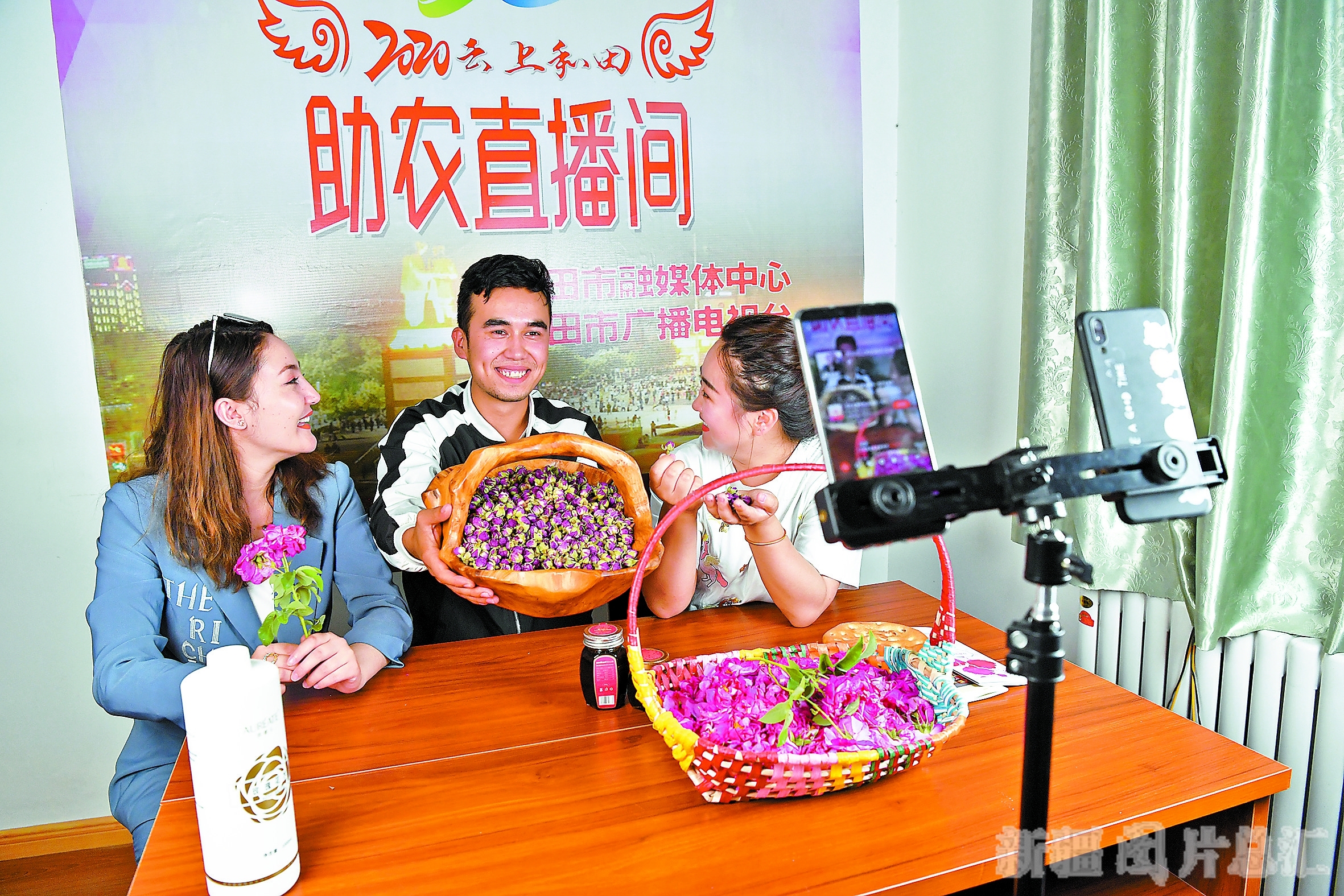 5月15日,在和田市融媒体中心,主持人与和田市依里其乡依盖尔其村农民吐送江·吐送买买提(中)一起直播销售玫瑰花。