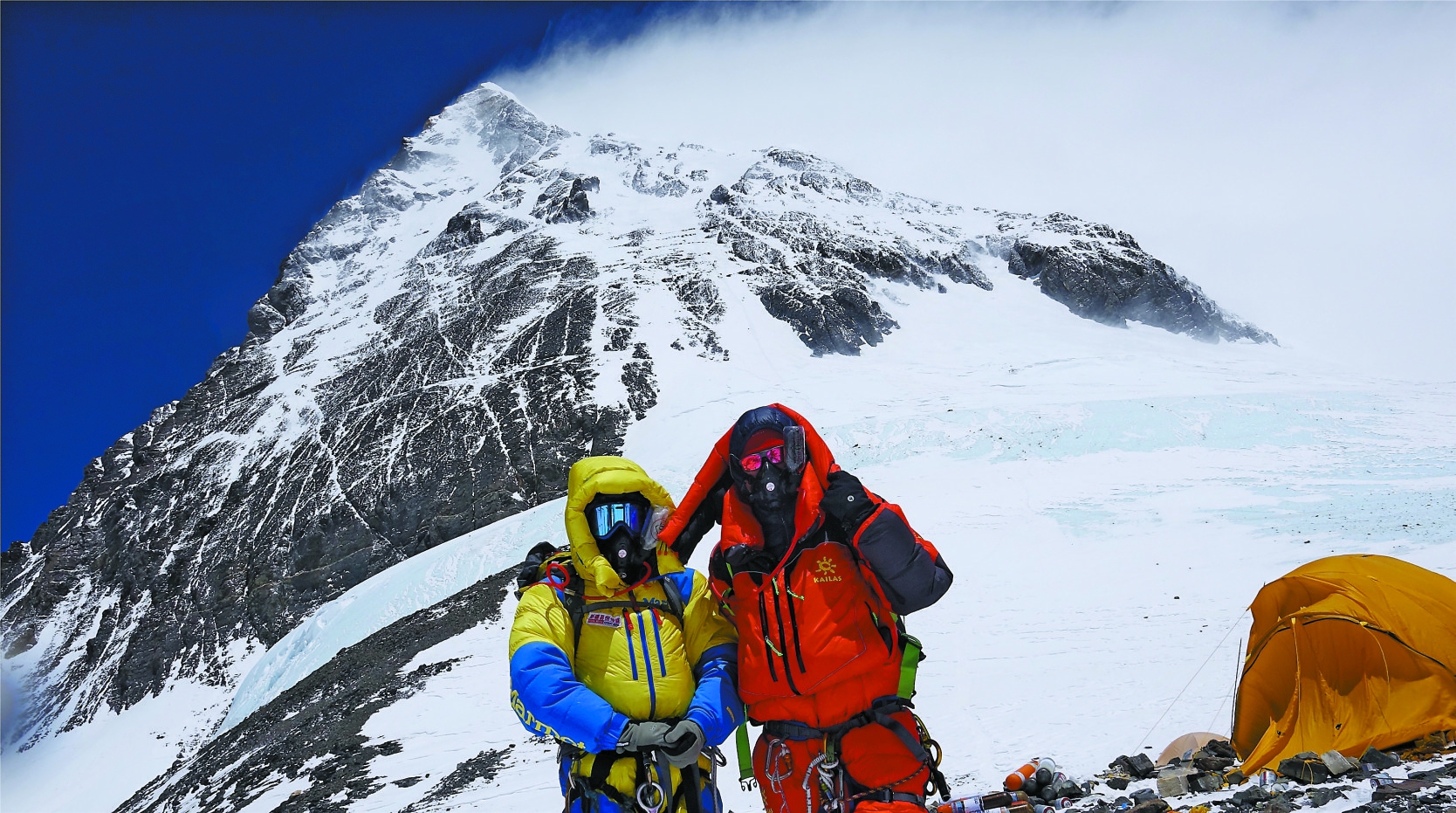 2017年5月19日,吕俊(右)与王铁男在珠峰C4营地合影。 □吕俊提供