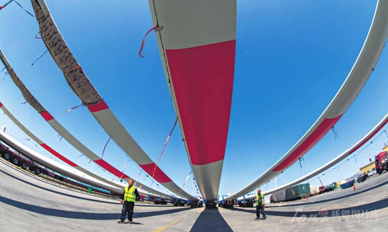 走进哈密市伊州区中材科技(伊吾)风电叶片有限公司,一条条超过百米的叶片生产线上,工人们正在热火朝天地加紧赶制订单,车间内繁忙有序,厂房外长度超过100米的叶片整齐排列,等待装运。