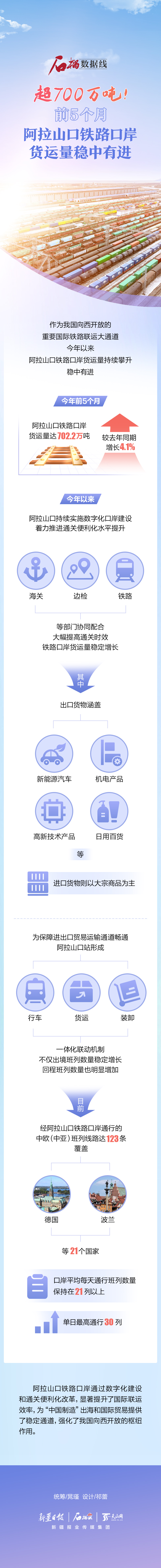 作为我国向西开放的重要国际铁路联运大通道,今年以来,阿拉山口铁路口岸货运量持续攀升,稳中有进。今年前5个月,阿拉山口铁路口岸货运量达702.2万吨,较去年同期增长4.1%。