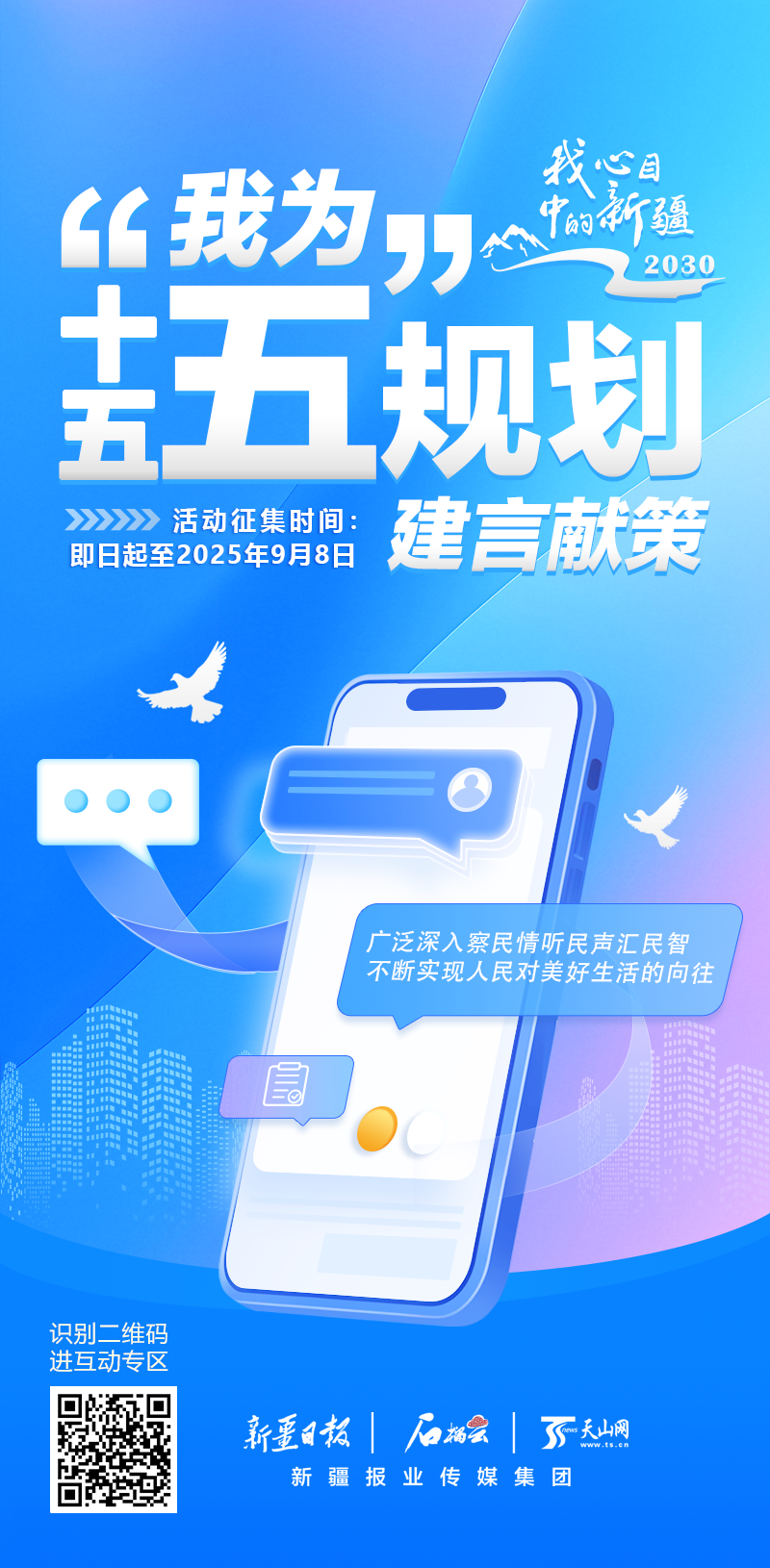 天山网-新疆日报讯(记者石鑫报道)为深入贯彻落实习近平总书记关于“十五五”规划编制工作的重要指示精神,紧扣铸牢中华民族共同体意识工作主线,锚定新疆在国家全局中的“五大战略定位”,紧贴民生推动高质量发展,科学编制“十五五”规划,按照自治区人民政府安排,自治区发展改革委联合新疆日报社(新疆报业传媒〈集团〉有限公司)启动“我心目中的新疆2030—我为‘十五五’规划建言献策”活动,面向全社会公开征集意见建议。