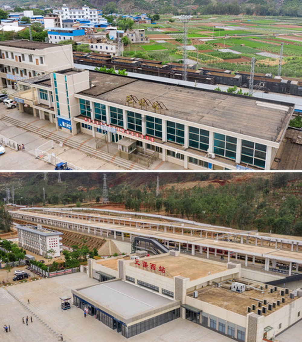 拼版照片:上图为成昆铁路经过的元谋站,于2019年12月30日零时起正式停止办理客运业务,如今承担货运功能(无人机照片,6月24日摄);下图为新成昆铁路经过的元谋西站,元谋西站于2019年12月30日开始办理客运业务(无人机照片,6月24日摄)。新华社记者 胡超 摄