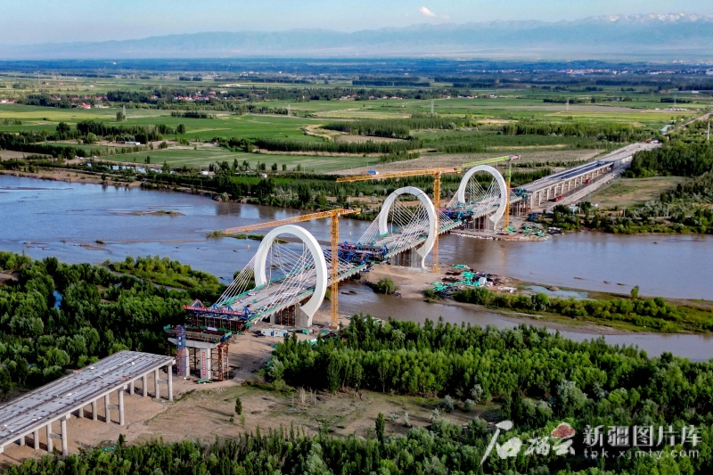 5月21日拍摄的雏形渐显的伊犁河三桥建设现场。石榴云/新疆日报记者 蔡增乐摄 伊犁河三桥建成后,将有效打通北岸英察路与察布查尔县X718线的天然屏障,串联起清伊高速、精河至都拉塔口岸高速、G218、S313等多条重要交通干线,对促进区域经济社会发展具有重要意义。