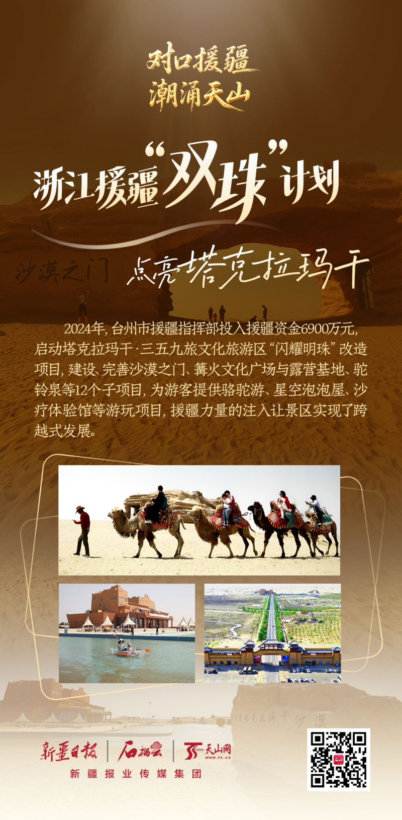 2021年5月,在浙江省台州市援疆指挥部的大力推动下,塔克拉玛干·三五九旅文化旅游区成功通过评定,晋升为国家5A级旅游景区。 2023年,浙江省援疆指挥部联合阿克苏地委等共同部署推进浙江文旅援疆“双珠”计划,推动沙漠之门景区再升级。 2024年,台州市援疆指挥部投入援疆资金6900万元,启动塔克拉玛干·三五九旅文化旅游区“闪耀明珠”改造项目,建设完善沙漠之门、篝火文化广场与露营基地、驼铃泉等12个子项目,为游客提供骆驼游、星空泡泡屋、沙疗体验馆等游玩项目,援疆力量的注入让景区实现了跨越式发展。 监制:晁瑾 设计:缪蓉 文案:拍热扎提·阿不都