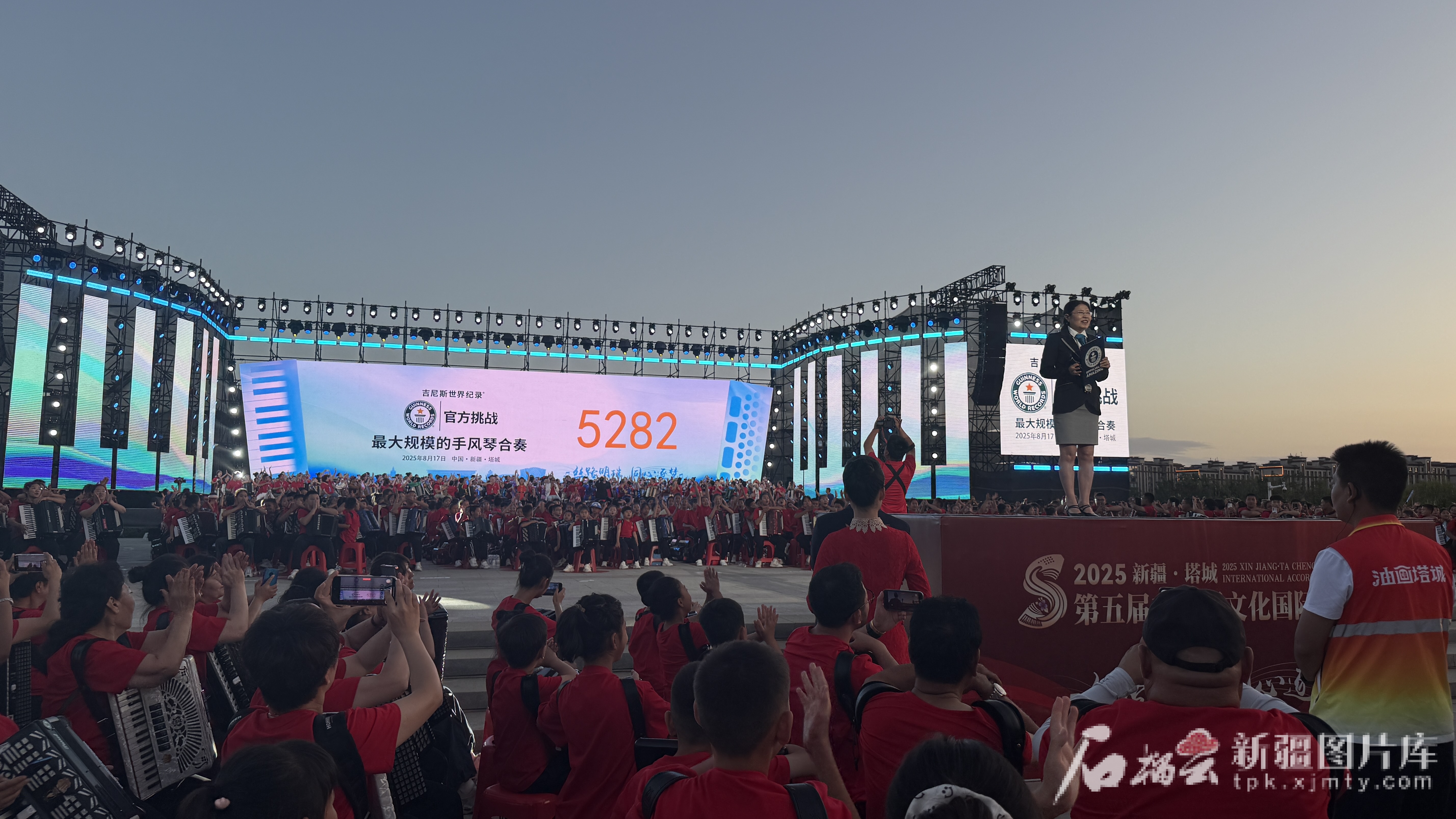 天山网-新疆日报讯(记者热依达报道)“我宣布,2025新疆塔城第五届手风琴文化国际艺术节中挑战吉尼斯世界纪录‘最大规模的手风琴合奏’有效人数为5282人。挑战成功!”8月17日晚,吉尼斯世界纪录现场认证官激动地宣布这一结果,现场近万名观众共同见证了这一历史性时刻。