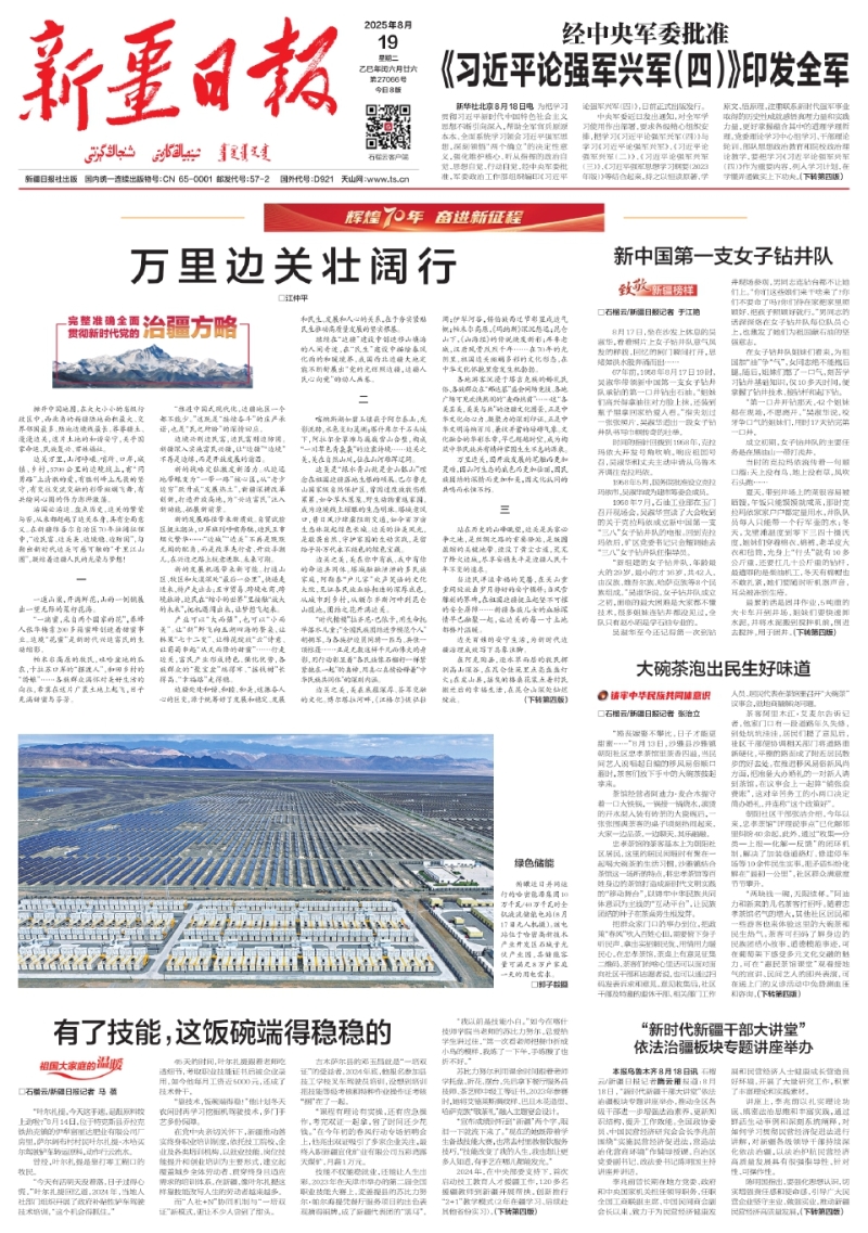 江仲平 摊开中国地图,在大大小小的省级行政区中,西北角的新疆陆地面积最大、交界邻国最多、陆地边境线最长。莽莽疆土、漫漫边关,这片土地的和谐安宁,关乎国家命运、民族复兴、百姓福祉。 边关万里,山河峥嵘。哨所、口岸,城镇、乡村,5700公里的边境线上,有“问勇路”上清澈的爱,有胜利峰上无畏的坚守,有交往交流交融的彩带斑斓飞舞,有共绘同心圆的伟力澎湃激荡。 治国必治边。盘点历史,边关的繁荣与否,从来都超越了边关本身,具有全局意义。在新疆维吾尔自治区70年壮阔征程中,“边民富、边关美、边境稳、边防固”,勾勒出新时代边关可感可触的“千里江山图”,凝结着边疆人民的光荣与梦想! 一 一道山梁,开满鲜花,山的一侧铺展出一望无际的菜籽花海。 “一滴蜜,采自两个国家的花”,养蜂人张华梅靠200多箱蜜蜂创造着甜蜜事业。边境“花蜜”是新时代兴边富民的生动缩影。 帕米尔高原的牧民,吐哈盆地的瓜农,卡拉苏口岸的“摆渡人”,和田乡村的“绣娘”……各族群众满怀对美好生活的向往,希冀在这片广袤土地上起飞,日子充满甜蜜与芬芳。 “推进中国式现代化,边疆地区一个都不能少。”这既是“接续奋斗”的庄严承诺,也是“民之所盼”的深情回应。 边境兴则边民富,边民富则边防固。新疆深入实施富民兴疆,让“边疆”“边境”不再是边缘,而是开放发展的前沿。 新的战略定位激发新活力。从边远地带蝶变为“一带一路”核心区,从“老少边穷”跃升成“发展热土”,新疆深耕改革创新,打造开放高地,为“兴边富民”注入新动能、拓展新前景。 新的发展路径带来新质效。自贸试验区挺立潮头,口岸班列呼啸奔驰,边民互市烟火繁华……“边城”“边关”不再是默默无闻的配角,而是改革先行者、开放弄潮儿,在兴边之路上锐意进取、未来可期。 新的发展机遇带来新可能。打通山区、牧区和大漠深处“最后一公里”,快递走进来、特产走出去;互市贸易、跨境电商、跨境旅游,边民在“缩小的世界”里接触“放大的未来”,把机遇闯出来,让梦想飞起来。 产业可以“大而强”,也可以“小而美”。让“新”鲜飞向五湖四海的餐桌、让林果“七十二变”、让棉花绽放“云”诗意、让葡萄串起“从天而降的甜蜜”……行走边关,富民产业形成特色、强化优势,各族群众的“聚宝盆”端得牢、“摇钱树”长得高、“幸福路”走得稳。 边疆处处和谐、和睦、和美,这振奋人心的巨变,源于统筹好了发展和稳定、发展和民生、发展和人心的关系,在于夯实紧贴民生推动高质量发展的坚实根基。 继续在“边疆”建设中创造移山填海的人间奇迹,在“民生”建设中描绘春风化雨的和暖境界,我国西北边疆大地定能不断舒展出“党的光辉照边疆,边疆人民心向党”的动人画卷。 二 喀纳斯湖如碧玉镶嵌于阿尔泰山,光影流转,水色变幻莫测;塔什库尔干石头城下,阿拉尔金草滩与巍巍雪山合璧,构成“一川草色青袅袅”的边塞诗境……边关之美,美在自然山川,壮在山河雄浑辽阔。 这美是“绿水青山就是金山银山”理念在祖国边疆落地生根的硕果。巴尔鲁克山国家级自然保护区,曾因过度放牧伤痕累累,如今草木葱茏、野生动物重返家园,成为边境线上耀眼的生态明珠。塔城老风口,昔日风沙肆虐阻断交通,如今百万亩生态林筑起绿色长城。边关的壮美风光,是敬畏自然、守护家园的生动实践,是留给子孙万代永不褪色的绿色宝藏。 边关之美,美在你中有我、我中有你的命运共同体。塔城融融泄泄的多民族家庭,阿勒泰“户儿家”欢声笑语的文化大院,见证各民族血脉相连的深厚底色。从城市到乡村,从额尔齐斯河畔到昆仑山腹地,团结之花开满边关。 “时代楷模”拉齐尼·巴依卡,用生命托举落水儿童;“全国民族团结进步模范个人”胡拥军,与各族护边员同骑一匹马、共住一顶帐篷……正是无数这样平凡而伟大的身影,用行动彰显着“各民族像石榴籽一样紧紧抱在一起”的真谛,用真心真情诠释着“中华民族共同体”的深刻内涵。 边关之美,美在底蕴深厚、荟萃交融的文化。博尔塔拉河畔,《江格尔》恢弘壮阔;伊犁河谷,锡伯族西迁节彰显戍边气概;帕米尔高原,《玛纳斯》深沉悠远;昆仑山下,《山海经》的传说焕发新彩;库车老城,汉唐风骨烈烈千年……在70年的光阴里,祖国边关斑斓多彩的文化形态,在中华文化怀抱里愈发生机勃勃。 各地游客沉浸于塔吉克族的婚礼民俗、各族群众在“那达慕”盛会同场竞技、各地广场可见欢快热闹的“麦西热甫”……这“各美其美,美美与共”的边疆文化图景,正是中华文化向心力、凝聚力的深刻印证,正是中华文明海纳百川、兼收并蓄的磅礴气象。文化融合的华彩乐章,早已超越时空,成为构筑中华民族共有精神家园生生不息的源泉。 万里边关,因开放发展的笔触而更加灵动,因山河生态的底色而更加壮丽,因民族团结的深情而更加和美,因文化认同的共鸣而永恒不朽。 三 站在历史的山峰眺望,边关是兵家必争之地,是丝绸之路的重要驿站,是版图盈缩的关键地带。湮没了黄尘古道,荒芜了烽火边城,尽享安稳太平是边疆人民千年不变的追求。 当边民洋溢幸福的笑靥,在关山重重间绽放出岁月静好的安宁模样;当风雪雕刻的界碑,在祖国边疆挺立起坚不可摧的安全屏障……新疆各族儿女的血脉深情早已融聚一起,让