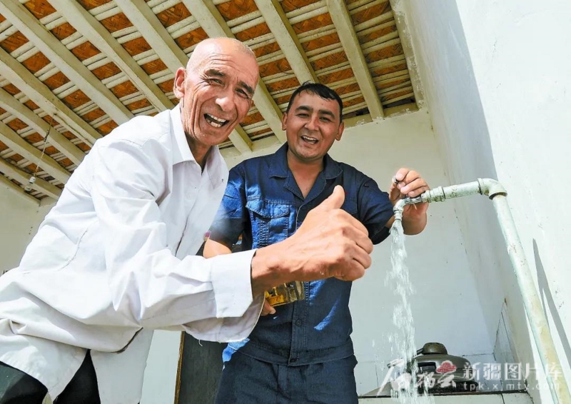 2020年6月16日,伽师县古勒鲁克乡供水站工作人员帮古勒鲁克村村民阿卜杜热西提·阿卜来提(左)更换了新水龙头(资料图)。自治区水利厅供图 滴水润民生 “涝坝水早已经变成展馆里的老照片了。”伽师县居仁镇开旦木加依村村民麦合木提·艾尔西在自家院子用水管浇花时感慨,村里的老人还记得背着水桶去涝坝取水的场景,卫生不达标的饮水造成村民们频繁患病。麦合木提记得,30年前全县启动防病改水工程,深井打了,自来水通了,但高氟、高砷的苦咸水依旧会带来氟骨症、砷中毒等困扰。直到2020年5月11日,慕士塔格峰的冰川雪水顺着112公里的输水管线流进这里。 如今在开旦木加依村,各家各户小院里葡萄爬满藤架,鲜果满枝花卉争艳,打开水龙头煮饭、泡茶,已成为村民们生活中习以为常的甜。那份关于水“稀缺而苦涩”的记忆,留在了伽师县饮水思源展示馆的照片里。 继2019年城乡饮水安全工程建设引来优质水源后,2023年伽师县又投资1.63亿元,实施城乡一体化供水工程、老旧管网巩固提升工程,将1.17万户使用老管道供水的用户迁移到新管道上。2024年实施的数字孪生工程,建成了从水源、水厂、输配水管网,到末梢广大用户用水全过程的自动化监测体系。如今的伽师县,规模化集中供水实现100%覆盖,农村饮水安全率达到100%,智慧平台守护饮水安全提升供水效能,这碗“甜水”的故事正不断掀开新篇章。 1986年以来,新疆开始农村供水工程建设,截至目前,累计投入342亿元,建成农村集中式供水工程1368处,农村供水管道16.95万公里,解决了1251万农村人口的饮水问题。“农村饮水安全是民生水利的重中之重,我们实现了从‘饮水难’到‘有水喝’再到‘喝好水’的历史性跨越。”自治区农村饮水安全中心副主任韩方军介绍,近年来实施的“苦咸水改水”工程,让3.16万群众告别饮用高氟水、苦咸水的历史。 目前,新疆农村自来水普及率达到99%,远超全国平均水平,规模化供水工程覆盖农村人口比例达到87.5%。“十四五”期间,新疆以“建大、并中、减小”为原则,在伊犁哈萨克自治州、阿克苏地区、喀什地区等11个地州市启动城乡一体化供水工程,新建改扩建城乡一体化供水工程97处,推进城乡供水同源、同网、同质、同服务、同监管,天山南北供水服务的均等化、精细化,为乡村振兴提供了坚实支撑。