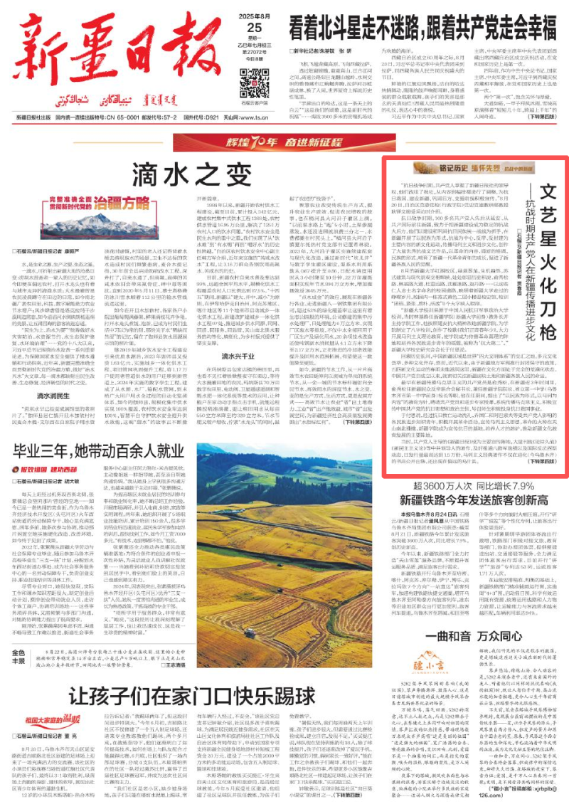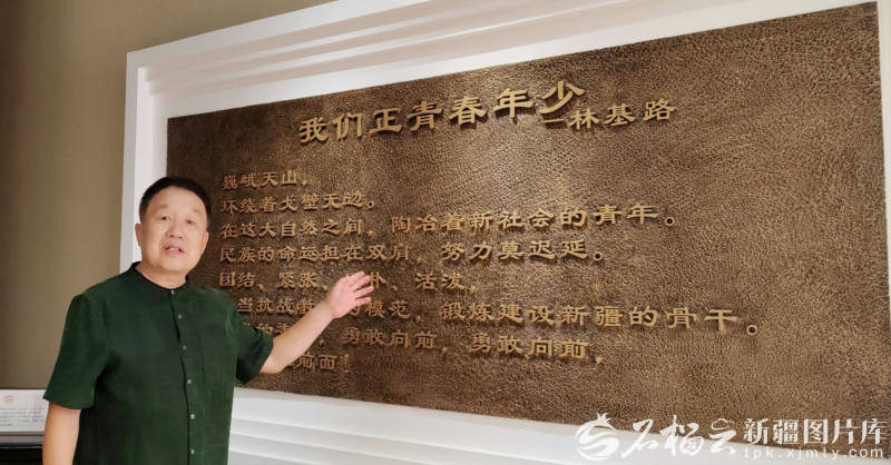 新疆日报社报史馆讲解员黄鹂讲解新疆日报上刊登的鲁少飞漫画作品《日寇残杀我同胞的惨状》。石榴云/新疆日报记者 贾春霞摄 抗日战争时期,100多名共产党人先后从延安、从共产国际前往新疆,致力于把新疆建设成为稳定的抗战大后方。他们以建设和巩固抗日民族统一战线为抓手,在新疆开展了以民族为形式、抗战为中心,反帝、反封建为主要内容的新文化运动,传播马列主义和进步文化,创作了大量优秀抗战文艺作品,以革命的内容、清新的格调、民族的形式,哺育了新疆一代革命青年的成长,促进了新疆各族人民的觉醒。 8月的新疆大学红湖校区,绿意葱茏,生机盎然,苏式建筑与现代景观交相辉映,处处彰显历史积淀。俞秀松路、林基路大道、杜重远路、沈雁冰路、赵丹路……以这些仁人志士名字命名的校园道路,映照着新疆大学走过的峥嵘岁月。校园内一栋苏式黄色二层小楼是校史馆,校训“团结、紧张、质朴、活泼”8个大字映入眼帘。 “新疆大学校训来源于中国人民抗日军事政治大学校训。当时林基路任新疆学院(新疆大学前身)教务长并主持学院工作,他按照延安抗大精神改造新疆学院,为学院制定了八字校训,创作了校歌《我们正青春年少》,大力开展马列主义理论教育,使学院成为传播革命真理的阵地和培养各民族进步青年的摇篮,被称为‘抗大第二’。”新疆大学校史研究会会长于付恩说。 回溯历史长河,中国新疆区域是世界“四大文明体系”的交汇之地,多元文化荟萃、多种文化并存。然而,近代以来,由于新疆地方军阀推行封闭保守的政策,五四新文化运动的春雨未能滋润这里。中国共产党自成立以来,就密切关注新疆这块土地和新疆各族人民的命运。