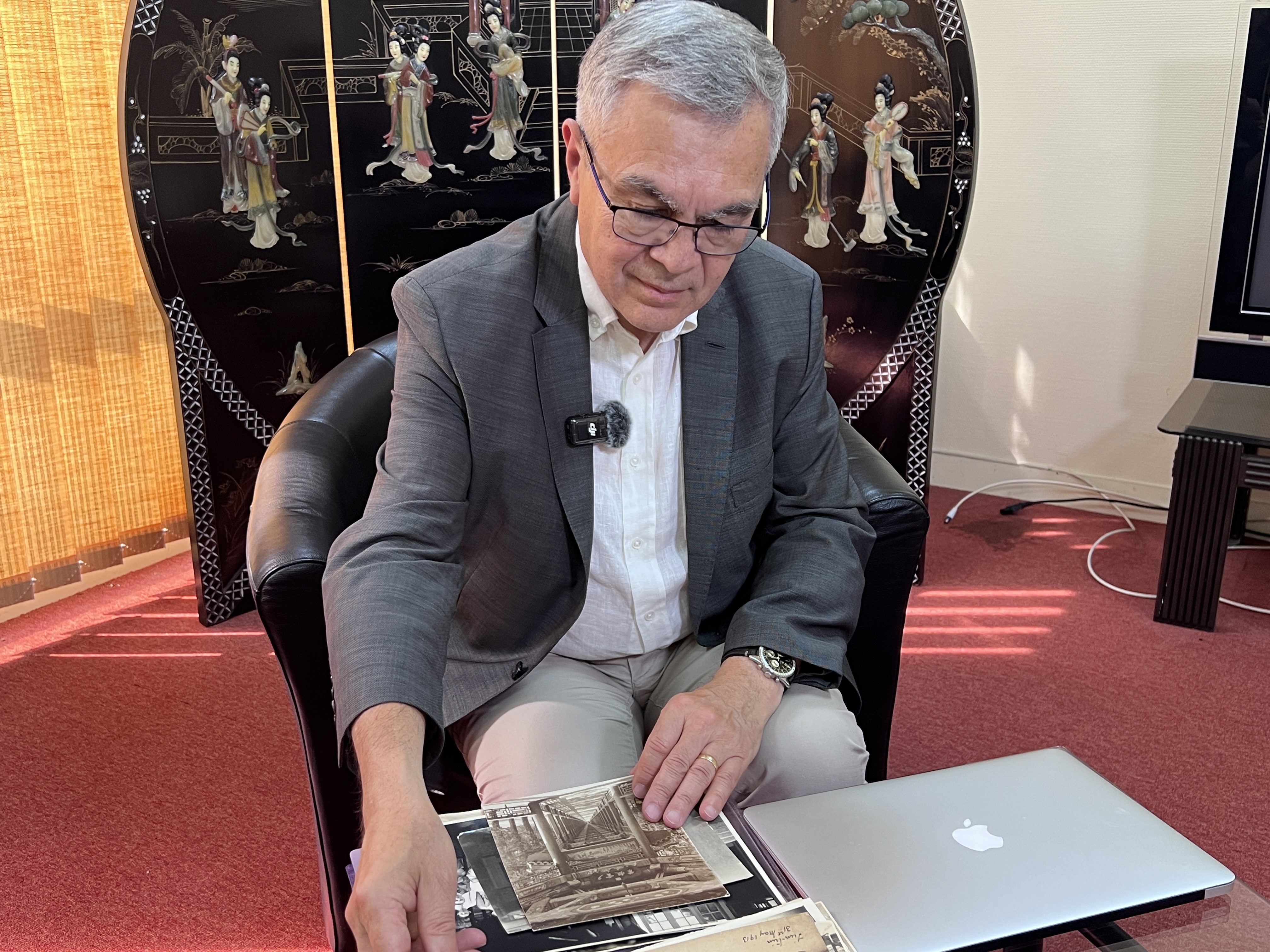 2025年6月23日,贝石涛在巴黎近郊接受记者采访时翻看与贝熙业医生相关的历史资料。新华社记者 孙鑫晶 摄