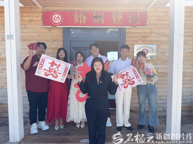 8月29日,在巴音布里克景区内,几对新人登记完一起合影。周苗摄 当天一早,巴音布鲁克景区婚姻登记处已接待7对新人。“还有几对预约登记的游客来电说正在赶路,特意请我们稍等。”巴音郭楞蒙古自治州天鹅湖旅游开发有限公司宣传营销部副主任周苗表示,为迎接新人,景区安排了文艺演出,并准备了伴手礼和终身会员福利,前50对登记新人还可获赠巴音布鲁克镇四星级酒店免费住宿。
