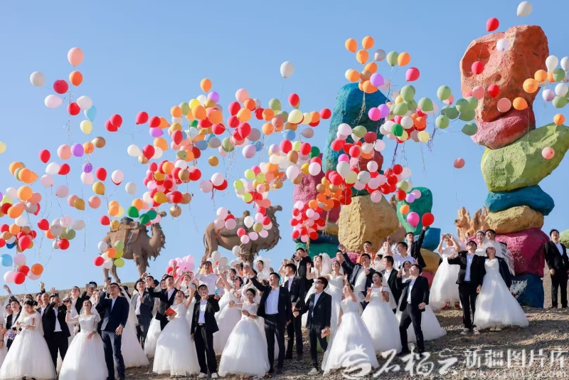 8月29日,哈密伊吾胡杨景区举办了一场盛大的集体婚礼。满晓霞摄 同样在七夕当天,哈密伊吾胡杨景区举办了一场集体婚礼。来自西藏、青海、四川、湖南及本地的50对新人,先在景区完成结婚登记,随后在象征坚贞爱情的胡杨林中共同开启婚礼。“全国首个胡杨婚姻登记处就落户在我们景区。我们提前在全国招募了50对新人,邀请他们来此登记,这些新人将成为景区的‘终身会员’。”青海西矿文旅公司总经理满晓霞介绍,即日起,景区将持续为结婚登记新人提供服务,全面接待来胡杨林拍摄婚纱照或举办婚礼的夫妇。