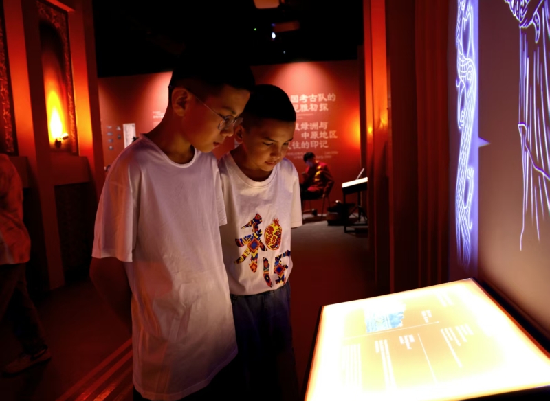 8月31日,“精绝七日·新疆尼雅遗址数字大展”在和田地区文化体育活动中心开幕,观众可在光影与交互中感受考古发掘工作,亲手推动数字织机编织出延续至今的锦绣纹样。石榴云/新疆日报记者 拍热扎提·阿不都 摄