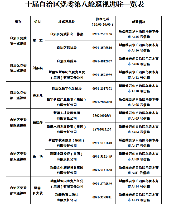 石榴云/新疆日报讯 根据自治区党委关于巡视工作的统一部署,截至8月29日,十届自治区党委第八轮巡视完成进驻工作。6个巡视组将对自治区党委社会工作部等4家区直部门(单位),新疆亚新煤层气投资开发有限责任公司等9家区属国有企业开展常规巡视。 被巡视部门(单位)、国有企业分别召开巡视进驻动员会。自治区党委各巡视组组长作动员讲话,对深入学习贯彻习近平总书记关于巡视工作的重要论述和党中央关于巡视工作的部署要求,扎实开展巡视工作提出要求。 自治区党委各巡视组组长指出,巡视是重要的政治工作,肩负“两个维护”的重大政治责任。自治区党委巡视组将坚持以习近平新时代中国特色社会主义思想为指导,深入学习贯彻党的二十大和二十届二中、三中全会精神,认真落实二十届中央纪委四次全会、自治区党委十届历次全会、自治区纪委十届五次全会和全国巡视工作会议安排部署,坚持围绕中心、服务大局;坚持政治监督,在落实“两个维护”根本任务上坚定不移;坚持以巡促治,在深化改革、促进发展上见行见效;坚持严的基调,在全面加强党的建设、纵深推进全面从严治党上担当作为;坚持人民至上,在发挥桥梁纽带作用上用心用力,精准有效开展政治监督。 自治区党委各巡视组组长要求,要坚持问题导向和系统思维,牢牢把握“四个落实”监督重点,深入了解被巡视党组织学习贯彻习近平总书记重要讲话和重要指示批示精神,完整准确全面贯彻新时代党的治疆方略,坚持党的领导,履行职能责任,统筹发展和安全,落实深化改革部署,纵深推进全面从严治党,加强领导班子、干部人才队伍和基层党组织建设,以及巡视、审计监督发现问题整改落实等情况,着力发现和推动解决突出问题,不断夯实管党治党政治责任,全面提升、推动高质量发展的能力水平。 被巡视党组织主要负责人表示,将深入学习贯彻党中央和自治区党委关于巡视工作的部署要求,提高政治站位,自觉接受监督,全力支持配合巡视组工作,坚持同题共答,以巡视为契机更好履行职责使命,用实际行动坚定拥护“两个确立”,坚决做到“两个维护”。 据悉,6个自治区党委巡视组将在被巡视部门(单位)、国有企业工作2个月左右,巡视期间设立专门值班电话、邮政信箱及巡视二维码,主要受理反映被巡视党组织领导班子及其成员、下一级党组织主要负责人和重点岗位人员问题的来信来电来访,重点是关于违反政治纪律、组织纪律、廉洁纪律、群众纪律、工作纪律和生活纪律等方面的举报和反映。巡视组受理信访时间截止到2025年10月28日。
