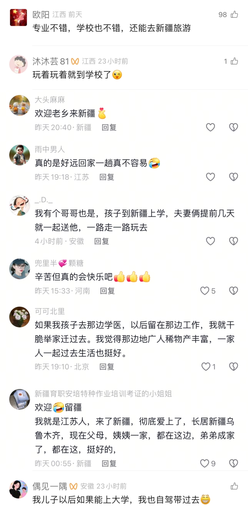 网友留言。 “一路上我们也有些担心,但到了新疆后发现这里跟想象中不一样,城市很新,人也很热情。”潘先生说,他们于8月26日抵达乌鲁木齐,在当地游玩了一天,参观了新疆国际大巴扎、新疆博物馆等景点,一家人都被新疆独特的文化魅力深深吸引。