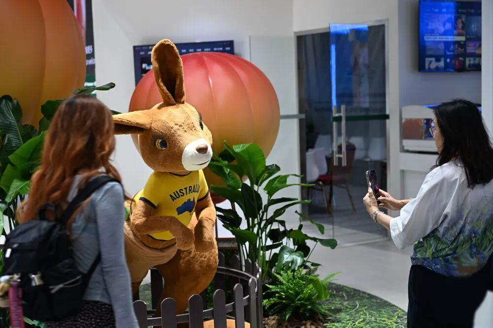 在今年的贺信中,习近平主席指出,中国将坚定不移扩大高水平对外开放,积极对接国际高标准经贸规则,加快在自由贸易试验区、国家服务贸易创新发展示范区等平台先行先试,有序推进服务市场开放,推动服务贸易高质量发展。  △本届服贸会主宾国澳大利亚展台一角
