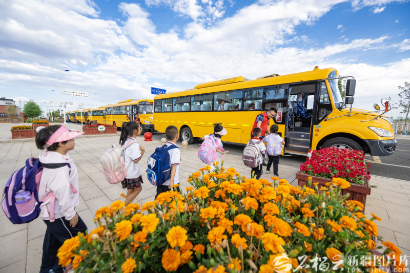 6月27日,准东九年一贯制学校一年级的同学们乘坐校车回家。何龙摄