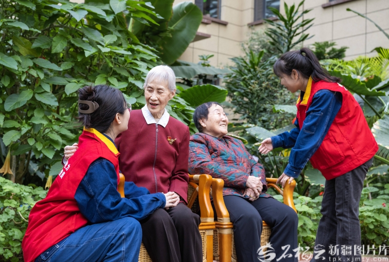 3月5日,昌吉市厚德康养家园,志愿者在陪老人们聊天。何龙摄