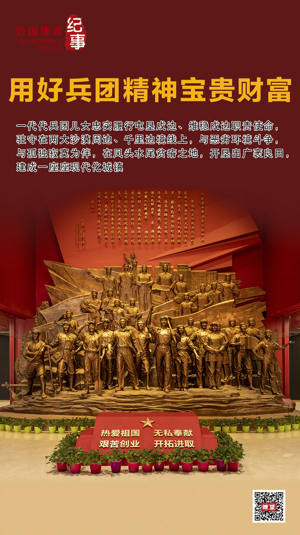 ◇2022年7月,习近平总书记在新疆考察时来到新疆生产建设兵团八师石河子市,参观新疆兵团军垦博物馆。会见兵团老中青三代建设者代表时,他强调,新疆生产建设兵团为推动新疆发展、增进民族团结、维护社会稳定、巩固国家边防作出了不可磨灭的贡献。兵团人铸就的热爱祖国、无私奉献、艰苦创业、开拓进取的兵团精神,是中国共产党人精神谱系的重要组成部分,要用好这些宝贵财富。 ◇71年来,一代代兵团儿女忠实履行屯垦戍边、维稳戍边职责使命,驻守在两大沙漠周边、千里边境线上,与恶劣环境斗争,与孤独寂寞为伴,在风头水尾贫瘠之地,开垦出万顷良田,建成一座座现代化城镇。 ◇32年守边岁月里,朱国利夫妇共计骑坏了8辆摩托车,换了6匹马,累计巡边近50万公里。 ◇“我离不开孩子们,孩子们也离不开我。”郭玥静说,如今,图木舒克早已成为她名副其实的家乡。 ◇“我就是戈壁滩上的一棵草,沙漠里的一粒沙,融入兵团,看到兵团发展壮大、祖国繁荣强大,这辈子非常值。” ◇情系牧民的“马背医生”李梦桃、坚持兵地共建的基层兵团干部、坚守深山牧区37载的“健康守护人”李琳、无私帮助200多哈萨克族牧民走出生活困境的“牧区暖阳”马殿英……来自五湖四海的兵团人成为维护和促进民族团结的中坚力量。 ◇紧盯团场职工群众种植需求,不断解决棉花生产实际问题,是赵海团队始终坚持的科研方向。 ◇新时代兵团人接力传承弘扬兵团精神,始终聚力发展先进生产力示范区,履行发展先进生产力的示范区功能,加快构建兵团特色现代化产业体系,推动经济高质量发展,努力把兵团建设得更强大更繁荣。 文 |《瞭望》新闻周刊记者 李自良 何军 苟立锋 在新疆组建兵团、履行特殊使命,是党中央治国安邦、强化边疆治理的战略安排。新疆生产建设兵团成立以来,广大干部职工扎根新疆沙漠周边和边境沿线,发挥了建设大军、中流砥柱、铜墙铁壁的战略作用。 对于新疆生产建设兵团的巩固与发展,习近平总书记念兹在兹,多次考察并作出重要指示。 “兵团的存在和发展绝非权宜之举,而是长远大计。新形势下兵团工作只能加强,不能削弱。”2014年4月,习近平总书记在新疆生产建设兵团考察时这样说。 2022年7月,习近平总书记在新疆考察时来到新疆生产建设兵团八师石河子市,参观新疆兵团军垦博物馆。会见兵团老中青三代建设者代表时,他强调,新疆生产建设兵团为推动新疆发展、增进民族团结、维护社会稳定、巩固国家边防作出了不可磨灭的贡献。兵团人铸就的热爱祖国、无私奉献、艰苦创业、开拓进取的兵团精神,是中国共产党人精神谱系的重要组成部分,要用好这些宝贵财富。 岁月有痕。71年来,一代代兵团儿女忠实履行屯垦戍边、维稳戍边职责使命,驻守在两大沙漠周边、千里边境线上,与恶劣环境斗争,与孤独寂寞为伴,在风头水尾贫瘠之地,开垦出广袤良田,建成一座座现代化城镇。 进入新时代,兵团主动融入和服务新疆大局,在民族团结、宗教和谐、文化引领、兵地融合等方面积极探索,充分发挥作为安边固疆稳定器、凝聚各族群众大熔炉、发展先进生产力和先进文化示范区的功能和作用,努力形成新时代兵团维稳戍边新优势,推动改革发展成果惠及兵地各族群众。  筑牢安边固疆的铜墙铁壁 屯垦废,则边疆乱;屯垦兴,则边疆宁。从2000多年前的西汉开始,在西域新疆大规模屯垦戍边,成为历代中央政权治理西北边疆,维护团结统一的多民族国家共同繁荣的重要手段。 1954年,党中央决定组建新疆生产建设兵团,通过创造性转化历史遗产,让“屯垦戍边”战略之举在西北边疆延续。 夏日清晨,乔老克哨所周边,虫鸣阵阵,胡杨翠绿。54岁的民兵朱国利早早起床侍弄羊群、马匹,准备开始一天的巡边。 作为边境线上的守护者,兵团民兵护边员是安边固疆、维护稳定的重要力量。在党中央部署下,兵团建立起纵深10-30公里的边境团场带。“放牧就是巡逻,种地就是站岗”成为许多边境团场民兵护边员一生的写照。 朱国利是土生土长的兵团人,从小便跟随父亲在马背上巡护祖国边境线。1993年,年仅22岁的朱国利来到位于中哈边境的兵团四师六十三团乔老克炮台,开始边放牧生产边义务守边。 忽明忽暗的煤油灯、混着泥沙的界河水、肆虐呼号的暴风雪……30多年来,无论环境如何艰苦,无论气候多么恶劣,朱国利和妻子王利始终坚持每天巡逻。“那时候没觉得苦,你看父辈们,比我们苦得多。国境线就是我的家,我要一直守在这里。”他说。 现在,朱国利和妻子所在哨所已成为团里的爱国主义教育基地。在这里,他们讲述女儿从小没有玩伴,只能和家里养的羊马玩耍;讲蚊子多得数不清,孩子夏天被叮了一身包;讲界河里的水全是沙子,沉淀完才能喝……不少外地来此研学的青年学子听得热泪盈眶,“这就是我们过去30多年每一天的经历。”王利说。 2005年,住了十多年地窝子的朱国利一家三口,搬进了水电暖齐全的新乔老克哨所,屋内电视机、电风扇等生活设施一应俱全。 时代进步,国家富强。从煤油灯照明、地窝子睡觉,到水电暖齐全的新哨所;从步巡眼看,到骑马、骑摩托巡逻并配备各类设备保障,兵团边境哨所各类设施条件持续改善,科技巡边护边能力大幅提升,但那份赤诚报国、戍守边疆的忠诚和担当始终不变。 2010年,经党组织考察批准,朱国利夫妇正式