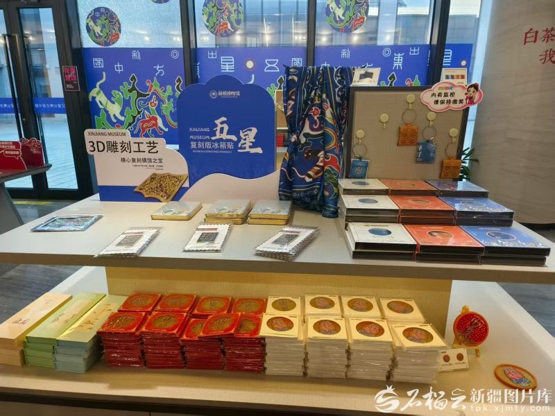 “五星出东方利中国”锦护臂系列文创产品。石榴云/新疆日报记者 王新红摄 “五星出东方利中国”锦护臂的数字化成果还延伸至日常生活领域。基于数字化纹样,新疆博物馆开发出丝巾、笔记本、茶具等一系列文创产品。这些产品既保留历史底蕴,又契合当代审美,在“新疆礼物”2024文创展评中荣获金奖,成为线上线下热销的文创商品。 “我们希望通过文创产品让数字化成果真正‘落地’,让更多人触摸文物温度。”关懿说。