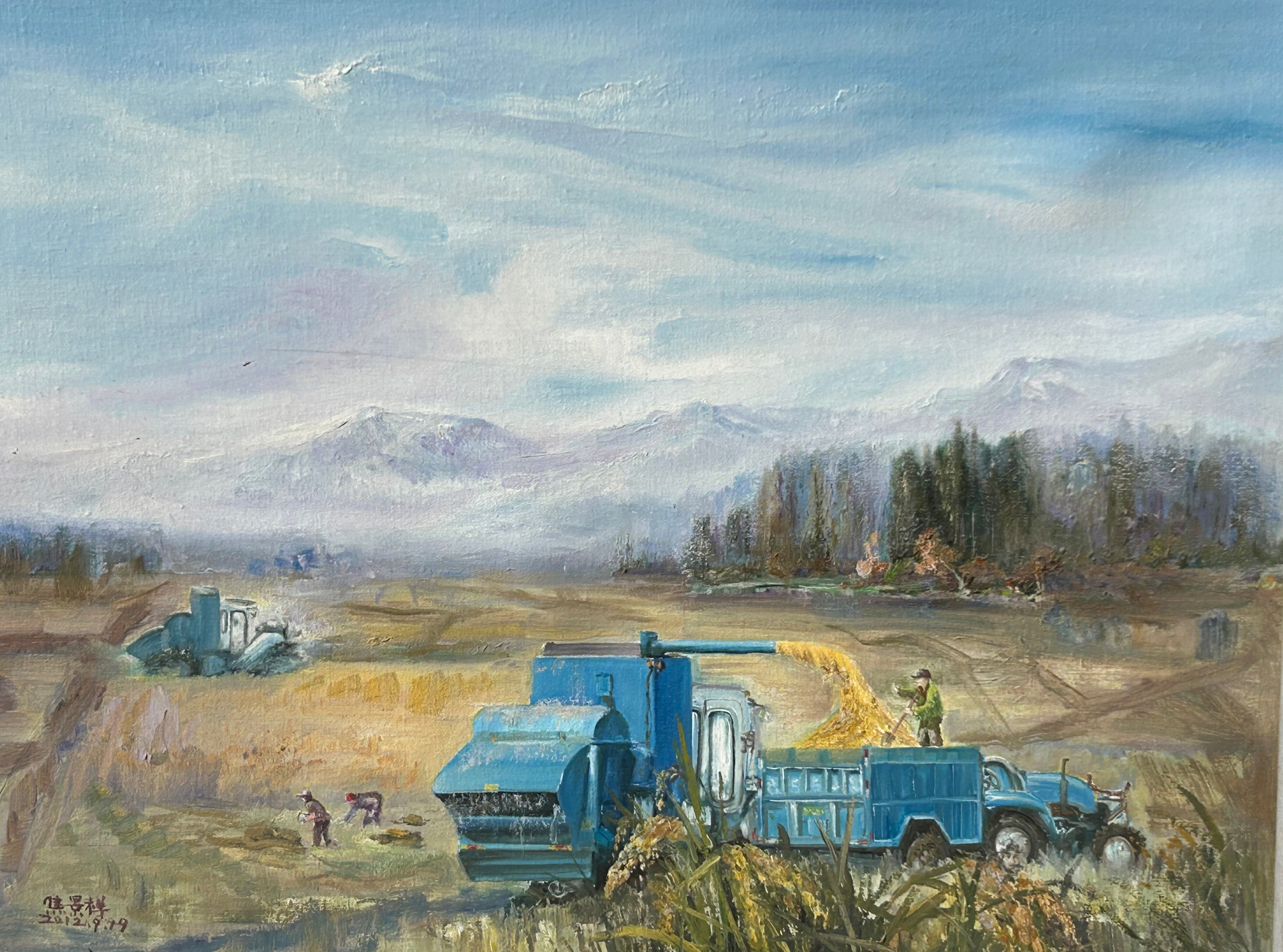 成熟的稻穗低垂、收割机行走在稻田里、几位农民正在弯腰捡拾稻穗……这是察布查尔锡伯自治县阔洪奇乡红旗村农民画创作者焦景祥的最满意的画作之一。