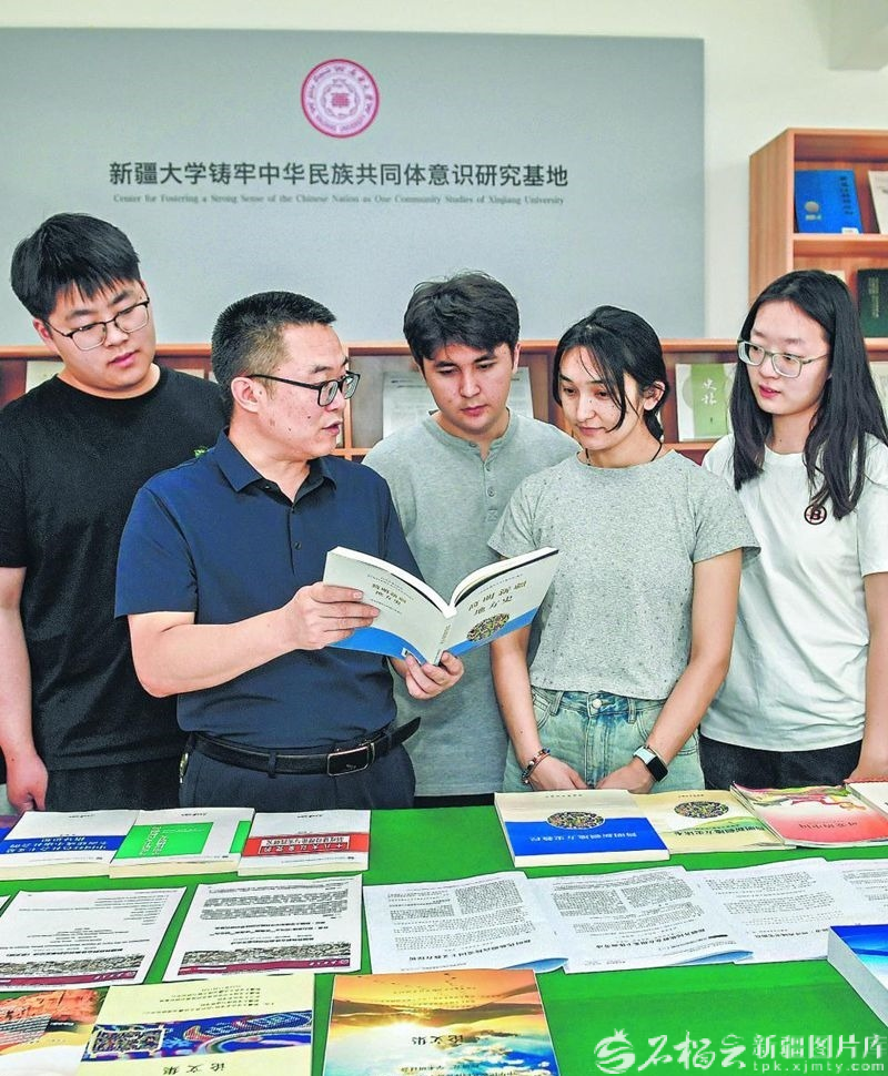 9月18日,全国首部《铸牢中华民族共同体意识主题教材:大学语文》在新疆大学正式投入使用。 这一成果的诞生,源于习近平总书记对新疆的深切关怀,源于新时代党的治疆方略的指引。2022年7月,习近平总书记视察新疆时,第一站就来到新疆大学。在新疆大学铸牢中华民族共同体意识研究基地,习近平总书记强调:“各民族命运始终同中华民族整体命运紧密相连,中华文明是新疆各民族文化的根本所在。” 总书记的嘱托为新疆大学推进中华民族共同体基础性问题研究指明了方向。 新疆大学牢记总书记的殷殷嘱托,依托学校铸牢中华民族共同体意识研究基地、新疆历史文化研究中心等平台,聚焦中华民族共同体历史、中华民族多元一体格局研究等课题,持续深化理论研究与实践探索。 新疆大学铸牢中华民族共同体意识研究基地相关负责人介绍,基地获批建设5年来,坚持以习近平新时代中国特色社会主义思想为指导,在师资建设、学科发展、人才培养等方面取得显著成效,首轮建设获评“优秀”,第二轮中期评估成绩突出。 “这些年,我和同学们坚持深入基层一线,把论文写在大地上。”2022年10月,新疆大学“石榴花”铸牢中华民族共同体意识青年宣讲团成立,马克思主义学院学生古扎努尔·玉苏甫成为宣讲团成员之一。她和同学们深入南北疆学校、乡村、企业和社区,用“青言青语”讲好铸牢中华民族共同体意识的故事。近年来,新疆大学每年组织15支团队开展专题调研,引导师生深入乡村、社区一线,在实践中深化理论认知。