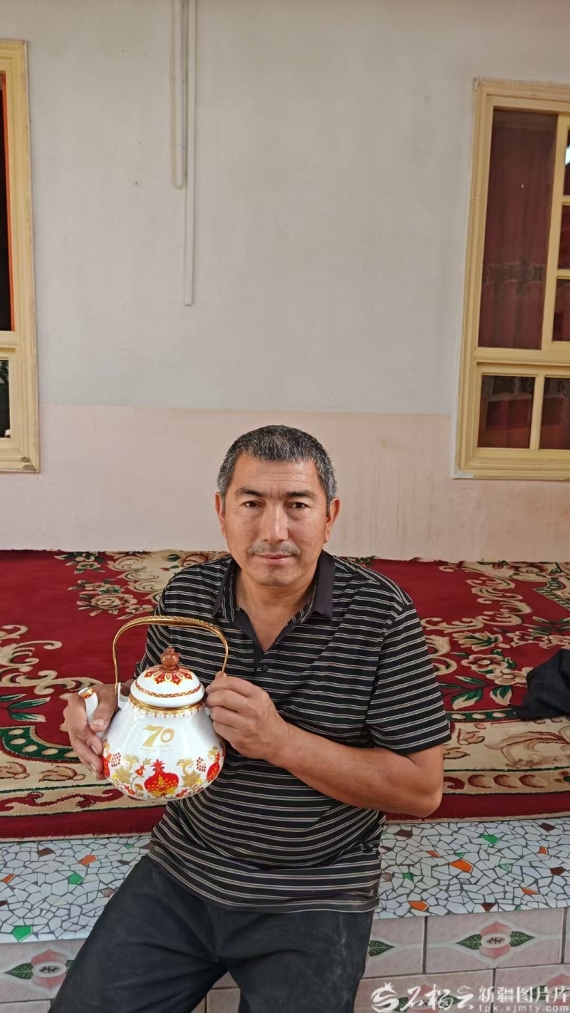 9月26日,阿卜都克尤木·肉孜拿着中央代表团赠送的礼物,十分欣喜。石榴云/新疆日报记者 李杨摄 阿卜都克尤木觉得,他是天底下最幸福的人。2014年4月28日,在新疆视察工作的习近平总书记曾走进他家中,那是终生难忘的珍贵记忆!没想到,在自治区成立70周年的喜庆时刻,北京亲人来了!9月25日下午,中央代表团走进他家的小院,带来党中央的关怀。 葡萄架上,一串串饱满的果实挂满枝头;门廊下,是贴着瓷砖的炕。抬眼一望,上方最醒目的是那张充满温暖的照片:总书记与阿卜都克尤木、村干部等坐在一起,眼中饱含深情。 阿卜都克尤木和妻子从屋里拿出中央代表团赠送的礼物,“这是北京亲人送的。我们全家不停地看呀、摸呀,心里就像喝了蜜一样。” “知道中央代表团要到家里来,我们一家都很期待,早早就把小院打扫干净,煮好了奶茶。”阿卜都克尤木回忆道,“进院后,我带着北京亲人看了牛圈和花房。我向他们汇报,养牛、卖花、烤全羊、农机服务等各项收入,加起来一年有17万元。” “这些年,党的好政策就像甜甜的葡萄,一串接一串。我们的日子越过越好。”阿卜都克尤木说。 他坐在炕上,指了指牛圈说:“总书记来我家时,我养了1头牛、8只羊,平时开拖拉机帮人犁地,收入不算高。现在我养的羊都不够用,每月烤全羊就要卖掉上百只呢!” 2014年,阿亚格曼干村人均纯收入4700元,村集体收入不足10万元。如今的阿亚格曼干村变了模样。宽阔笔直的柏油马路铺到村民家门口,家家户户住进了红顶白墙的安居房,做饭用上了天然气。村里有花卉种植、扫帚制作等农民专业合作社,有“民族乐器坊”“百年馕坊”等作坊及农家乐、民宿、超市、饭馆等,还有育苗大棚、牛羊养殖小区、就业创业孵化基地、特色蟠桃种植园等,大家在家门口就有事干、有钱赚。2024年,该村人均纯收入超2万元,村集体收入达256万元。 “中央代表团离开的时候叮嘱我们,要把日子过得更幸福。”阿卜都克尤木坚定地说,“请总书记放心,请党中央放心,我们一定牢记嘱托,靠双手创造更加美好的新生活。” 记者走出阿卜都克尤木家,漫步阿亚格曼干村主街道,映入眼帘的是绚丽多彩的墙绘:香甜的瓜果、灿烂的笑脸……这正是村民甜蜜生活的真实写照。