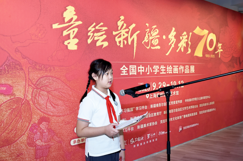 9月29日,“童绘新疆·多彩70年”全国中小学生绘画作品展在上海虹桥当代艺术馆开幕。这是“童绘新疆·多彩70年”征集活动小作者、上海市徐汇区龙南小学五年级三班蒋音好同学在开幕式上发言。(摄影:努尔夏提·尼加提)
