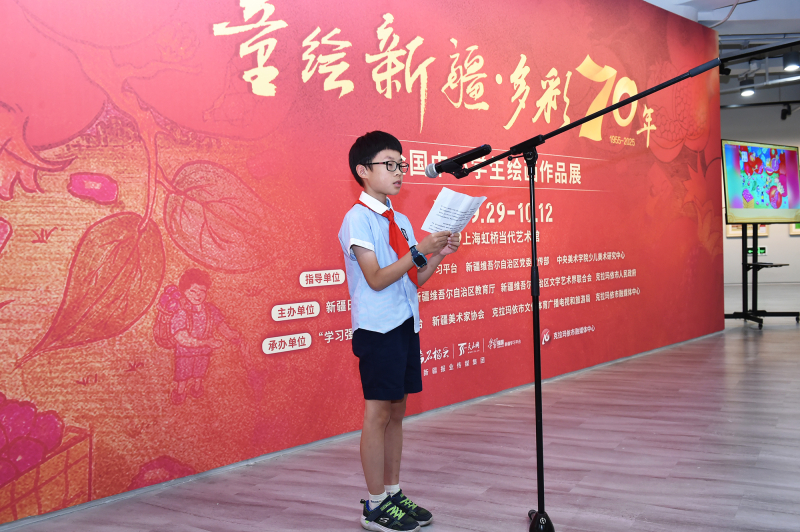 9月29日,“童绘新疆·多彩70年”全国中小学生绘画作品展在上海虹桥当代艺术馆开幕。这是“童绘新疆·多彩70年”征集活动小作者、上海市闵行区实验小学春城校区五年级一班吴非同学在开幕式上发言。(摄影:努尔夏提·尼加提)
