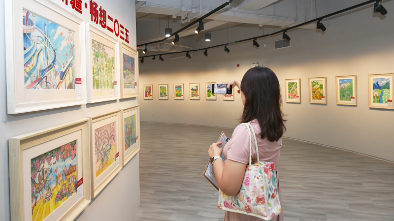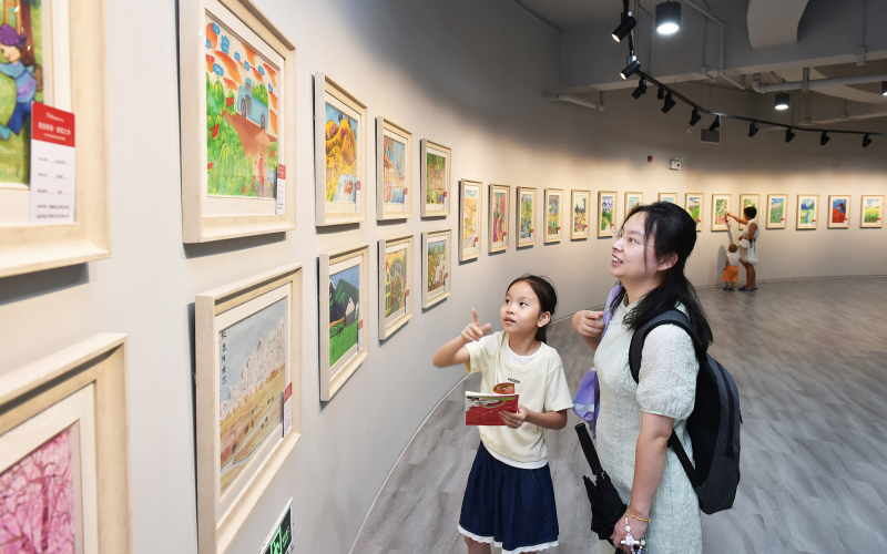 9月29日,“童绘新疆·多彩70年”全国中小学生绘画作品展在上海虹桥当代艺术馆开幕。这是观众在观展。(摄影:努尔夏提·尼加提)
