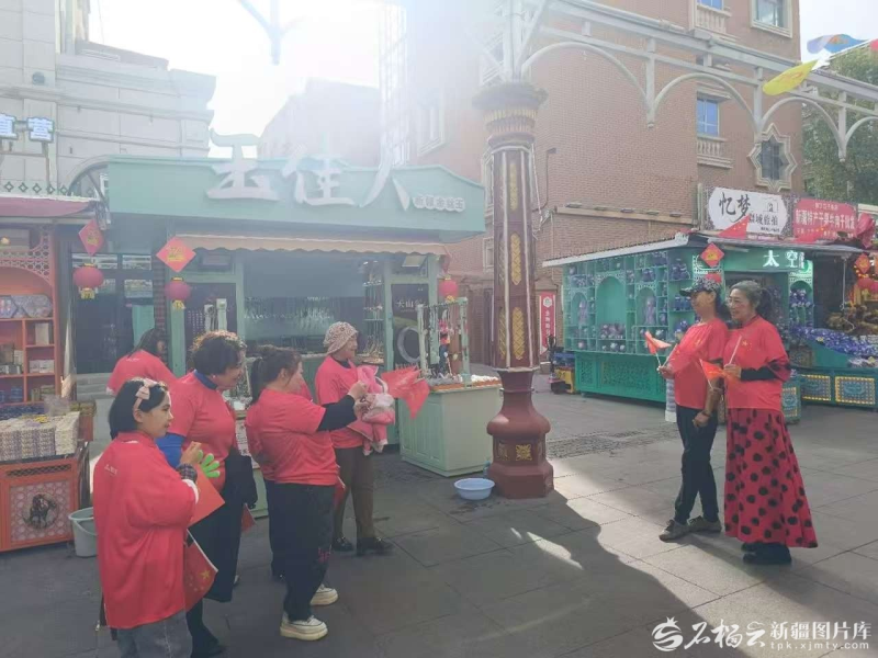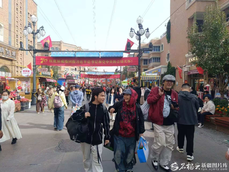 10月1日的乌鲁木齐大巴扎步行街。 石榴云/新疆日报记者 任江摄 10点,市民刘海涛就和伙伴们一起来到这里,穿着红色T恤,手里拿着国旗,脸上贴着庆祝自治区成立70周年的彩色贴纸,“我们来这里庆祝国庆节,又恰逢自治区成立70周年,祝福新疆越来越好,希望有越来越多的游客来新疆、来大巴扎,看看这里的发展变化。”刘海涛说。 在步行街,人潮涌动,随处可以看到手里挥动着国旗的游客、市民。来自四川的大学生张昊然和同伴们原本正在挑选手鼓,忽然身边有人齐唱《我和我的祖国》——原来是大巴扎步行街举行的“我把新疆唱给你听”快闪活动。他们随即加入合唱的队伍,“在‘歌舞之乡’唱这首歌,感觉每个音符都带着葡萄干的甜蜜!”张昊然说,在新疆旅游,最让他们感动的就是新疆的团结氛围,“互不相识的游客、当地人在一起,挥动国旗齐声高歌的场景,太感人了!”
